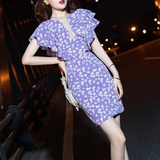 イブニングドレス パープル 花柄 フリル ミニ デイジー ワンピース タイト