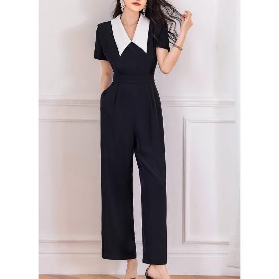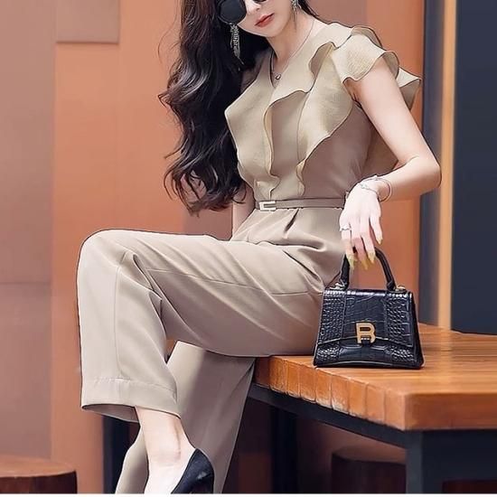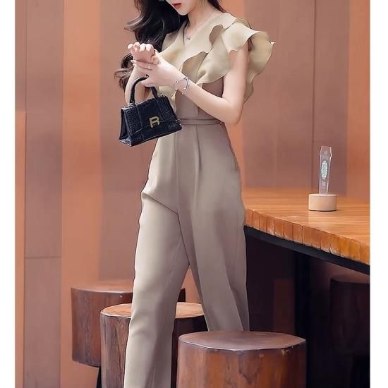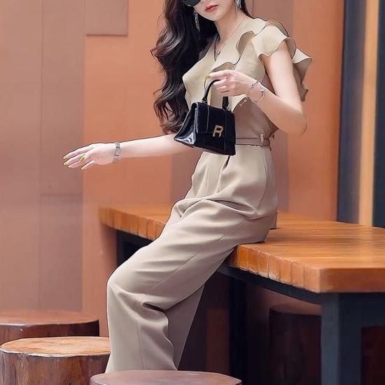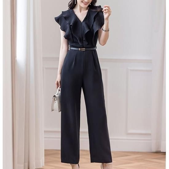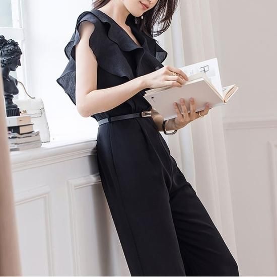 ジャンプスーツ フリル Vネック オールインワン パンツドレス サロペット ハイウエスト ワイドパンツ ドレープ ベルト 襟付き カラー パーティー お呼ばれ