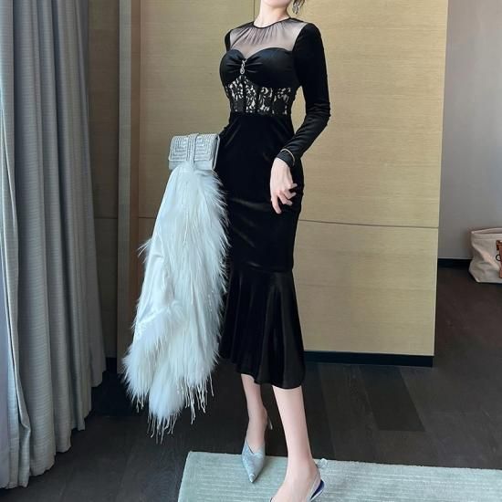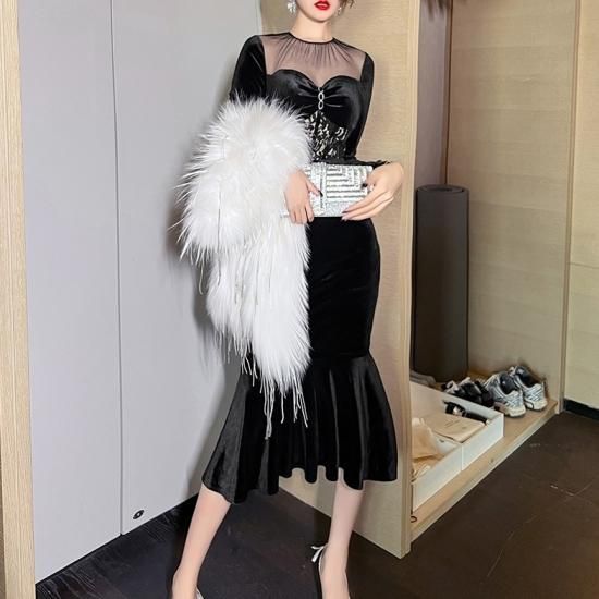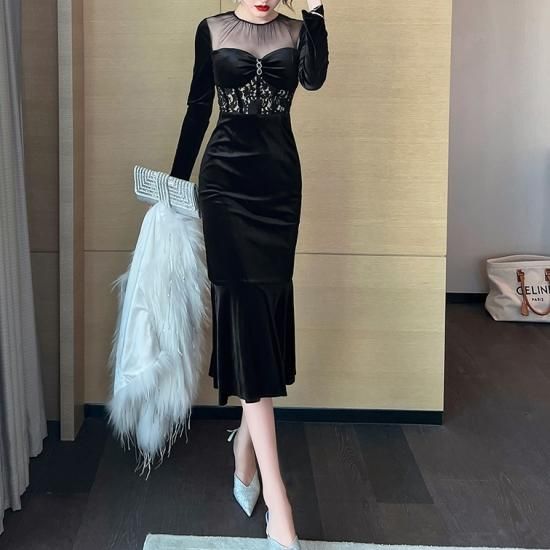 ドレス マーメイド ブラック 光沢 シースルー タイト ハイウエスト パーティー お呼ばれ