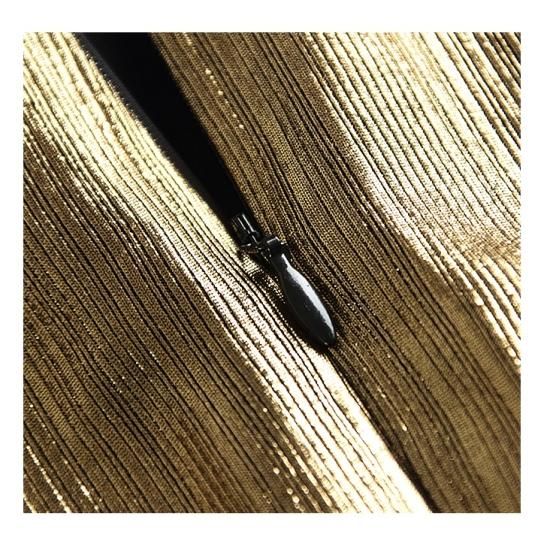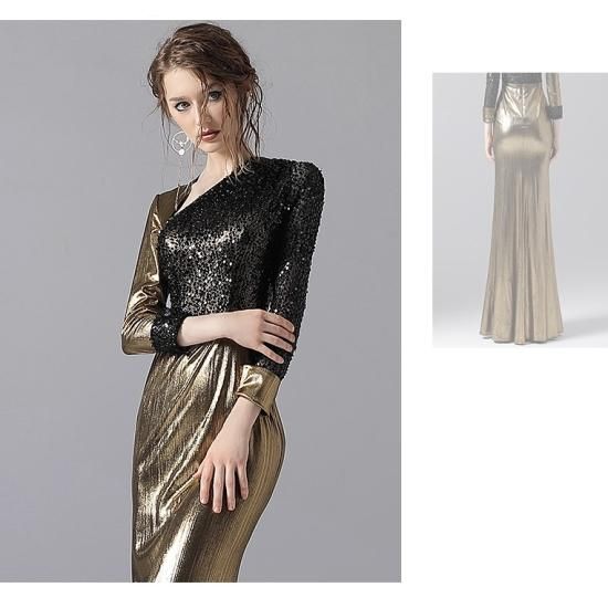 ブラック×ゴールドの配色がゴージャスなロングドレス。