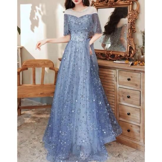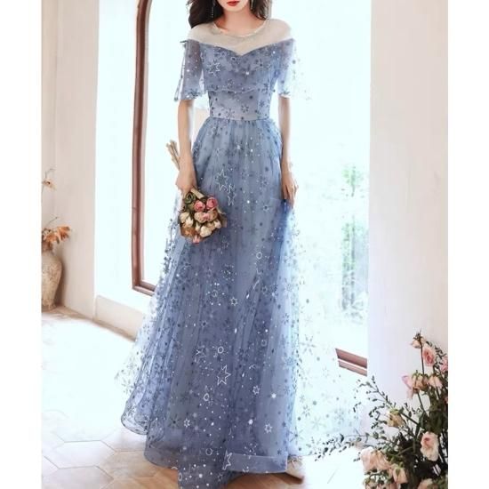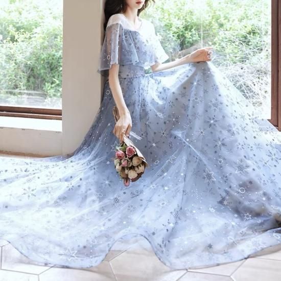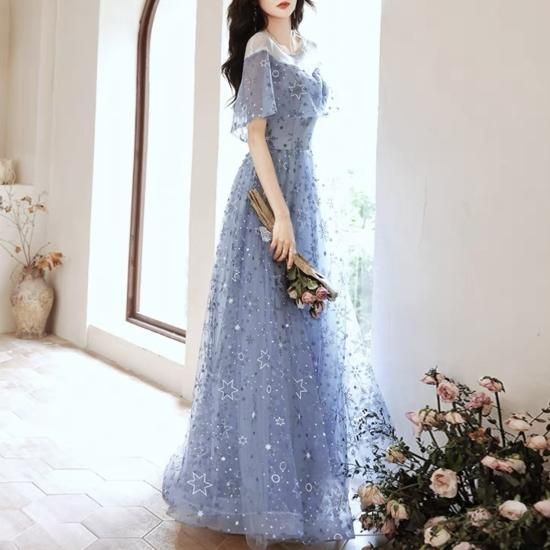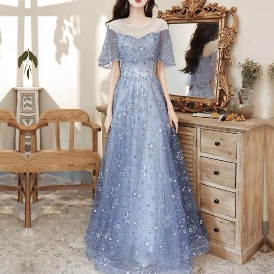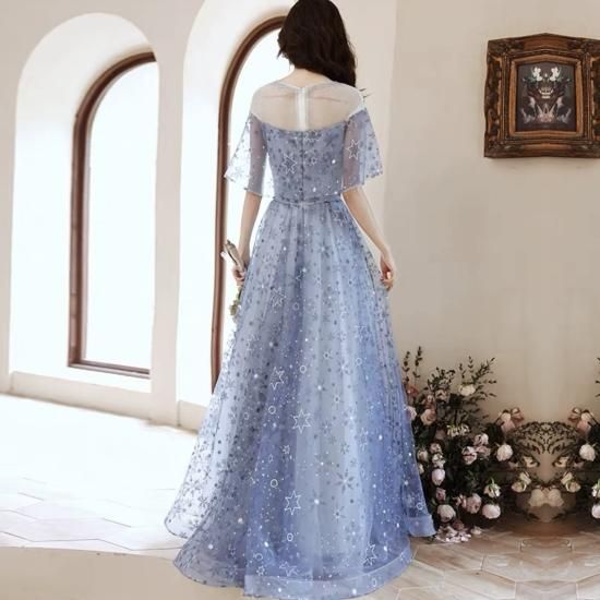 ロングドレス カラードレス チュール ラウンドネック フリル 星柄 軽やか Aライン 半袖 結婚式二次会 演奏会 発表会 ブルー系