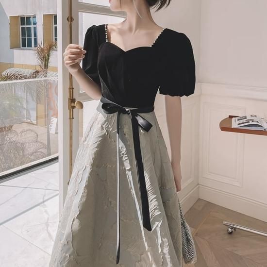ドレス ミモレ丈 ミディアムドレス ベルベット ボタニカル ペンタゴンネック パフスリーブ Aライン パール刺繍 クラシカル 上品 お呼ばれ 結婚式 結婚式二次会 記念日 発表会 ブラック系