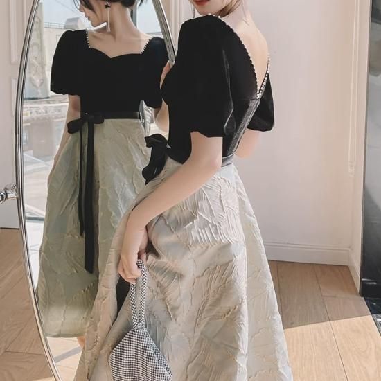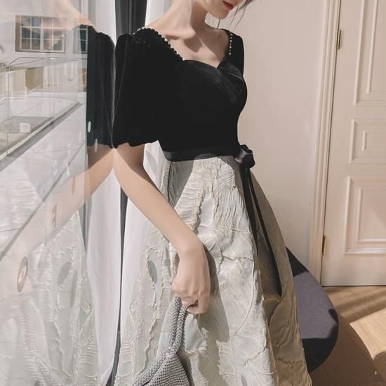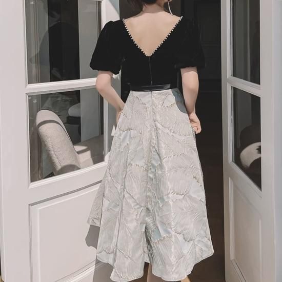 ベルベットに立体感のあるボタニカル柄のスカートをかけ合わせたデザインが上品なミディアムドレス