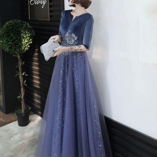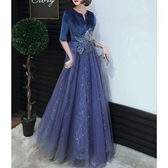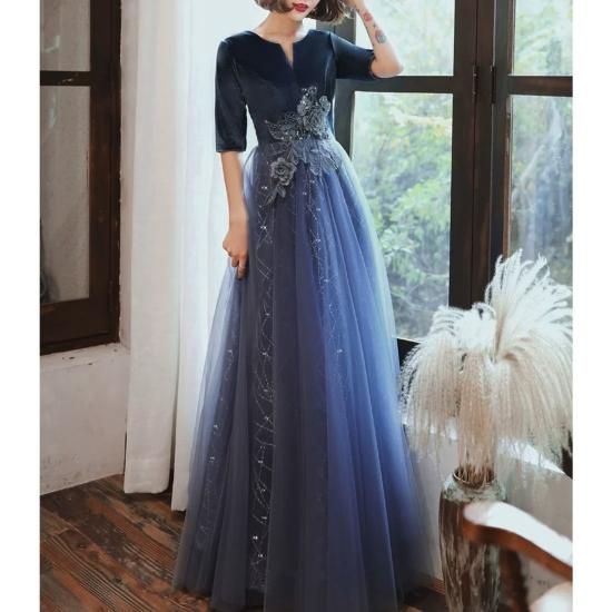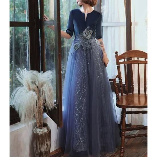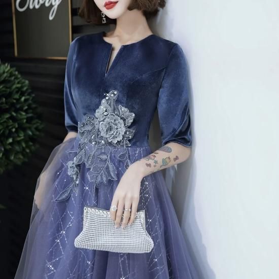 ロングドレス カラードレス オーガンジー ベルベット 五分袖 花刺繍 ボタニカル エレガント 露出控えめ 気品 結婚式 結婚式二次会 演奏会 発表会 ブルー系