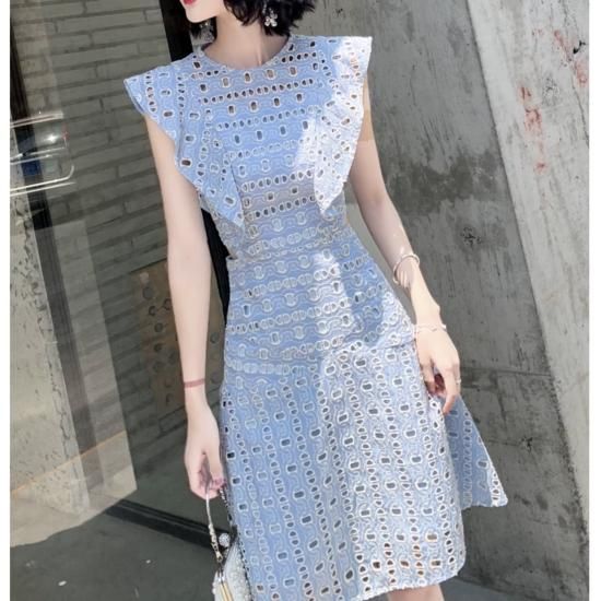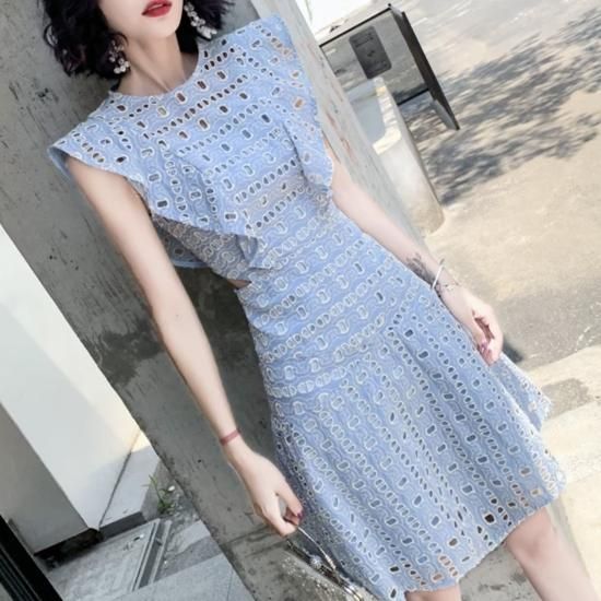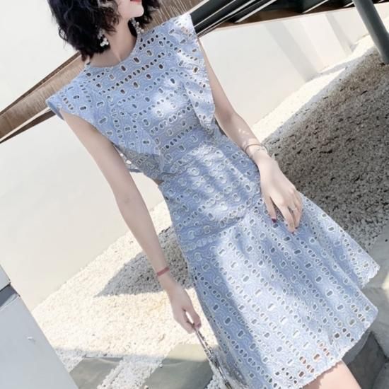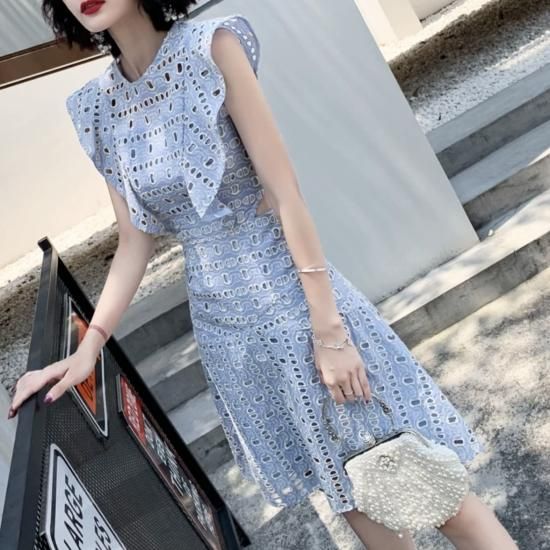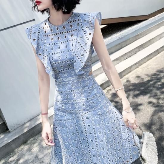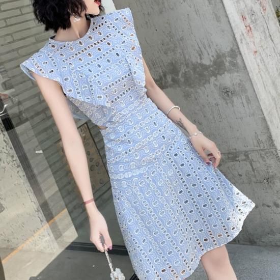 ドレス ワンピース ラウンドネック ノースリーブ ビックショルダー Aライン ミニ丈 クラシカル 上品 お呼ばれ 結婚式 結婚式二次会 記念日 ブルー系