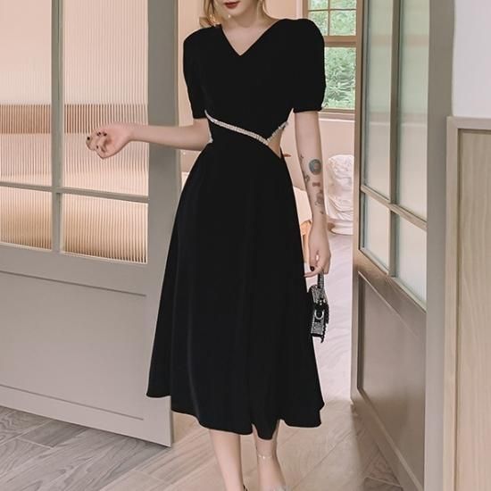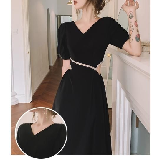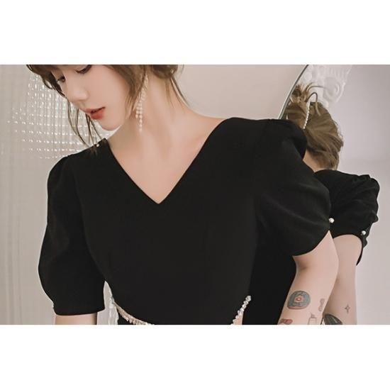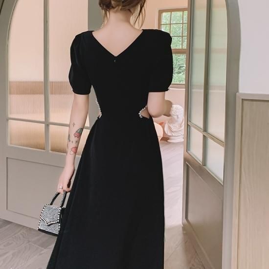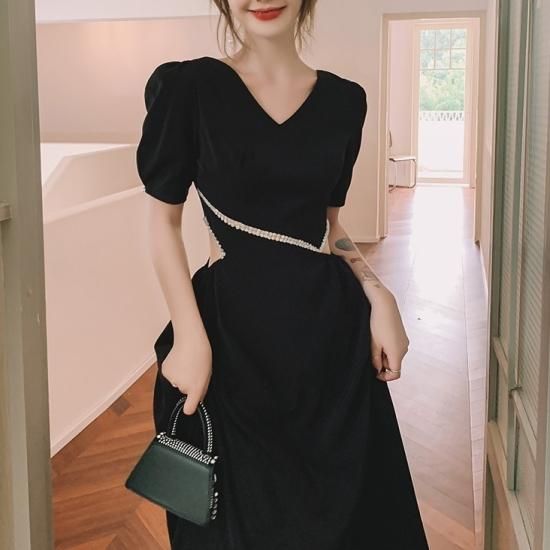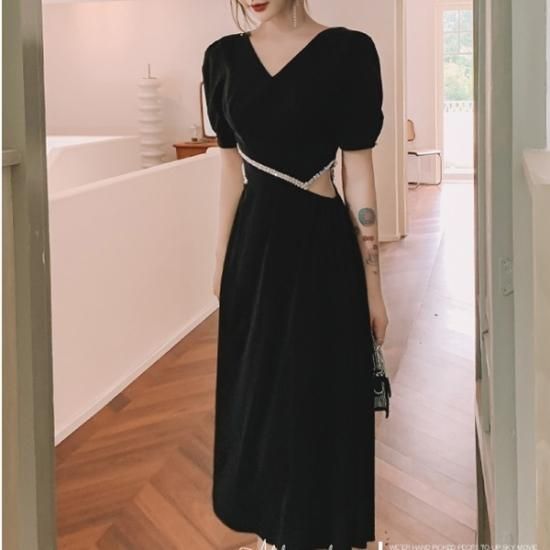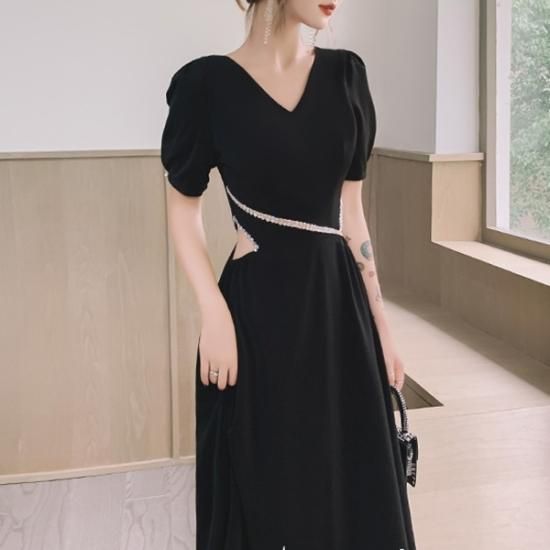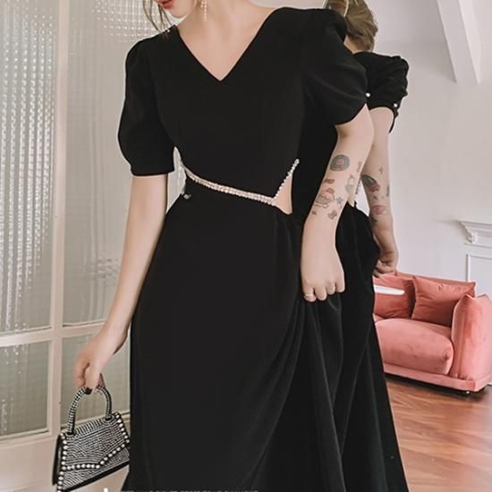 ドレス ワンピース カットアウト パール トレンド パフスリーブ フレア ブラック ホワイト 赤 パーティー お呼ばれ