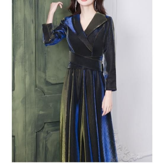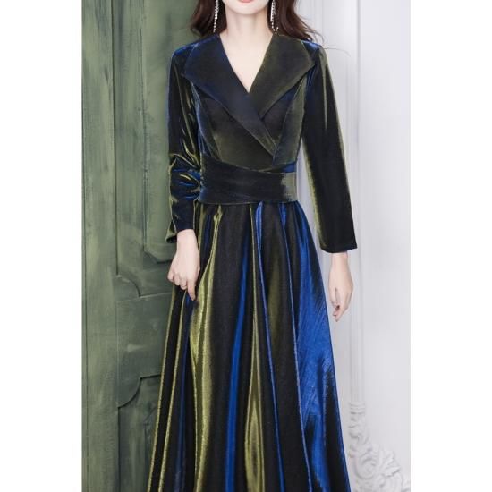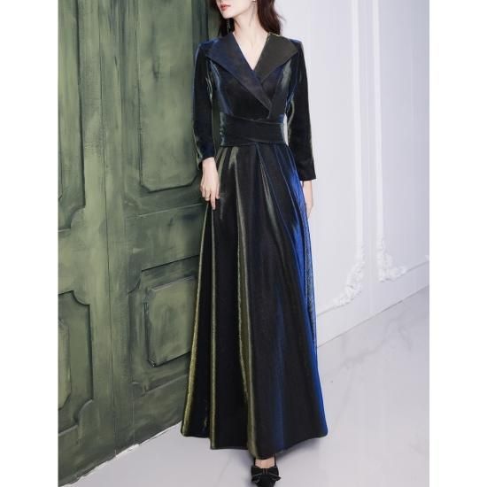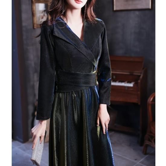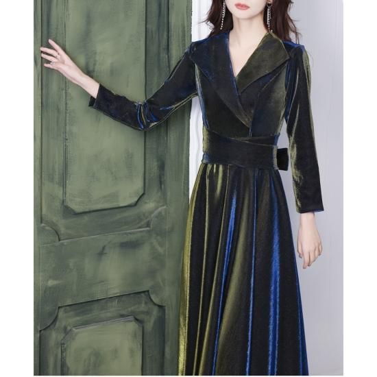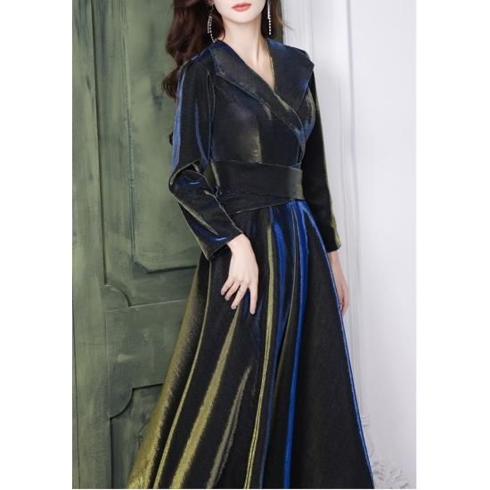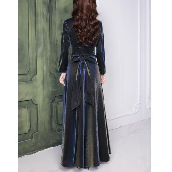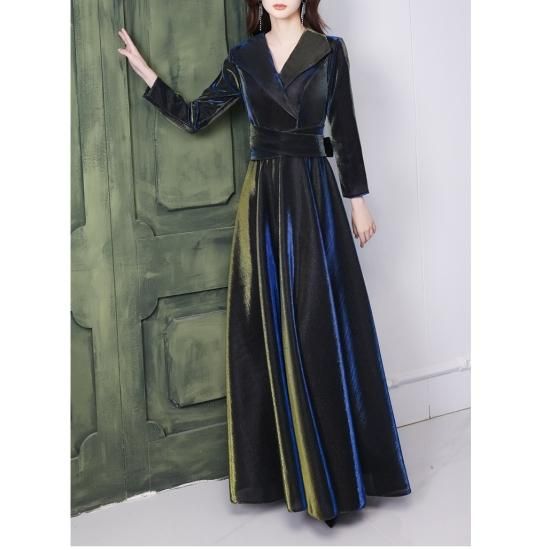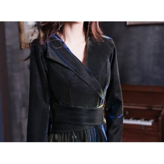 スーツ ドレス イブニングドレス 長袖 ローブ カラー 襟付き 光沢 ロング ベルト リボン パーティー お呼ばれ