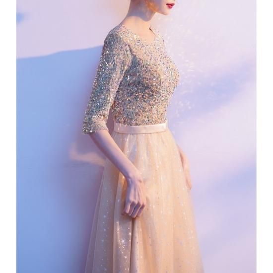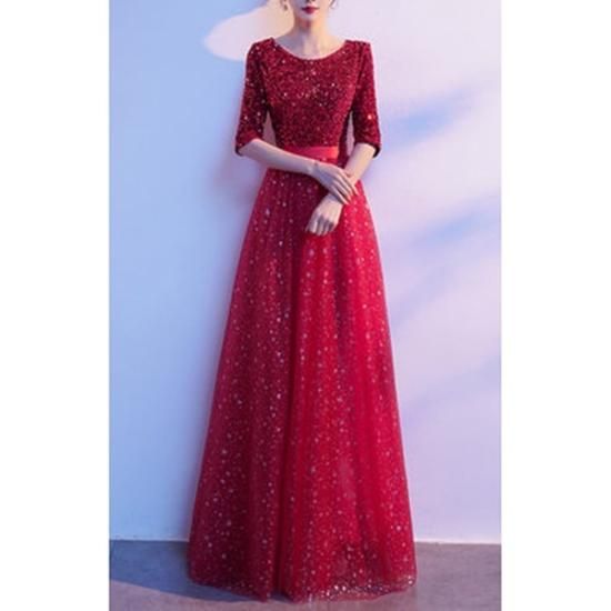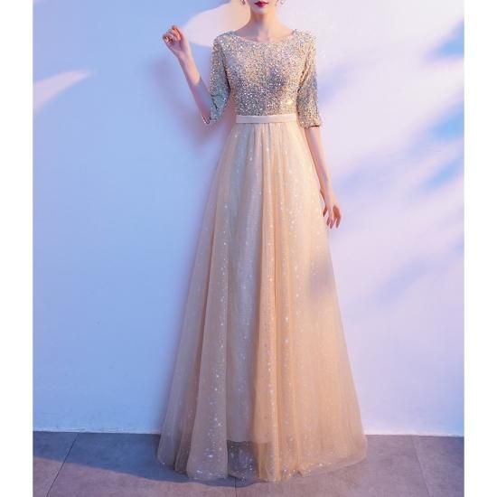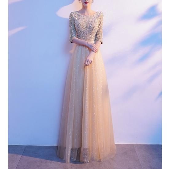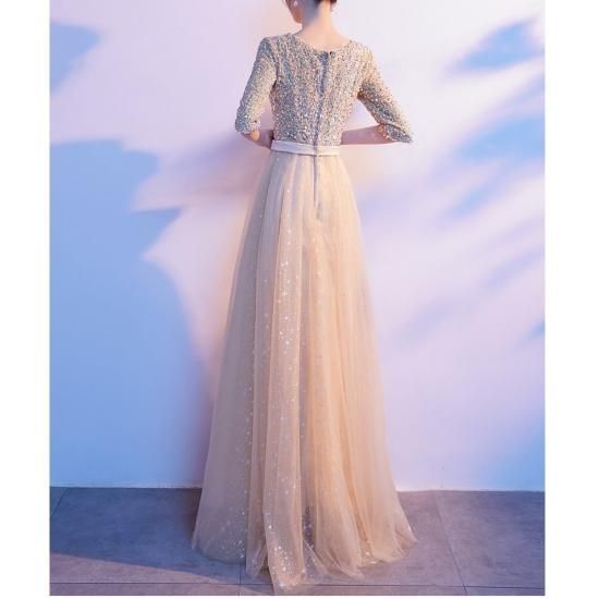 結婚式 ドレス スパンコール シャイニー キラキラ オーガンジー チュール ウエスト 七分袖 発表会 演奏会 二次会