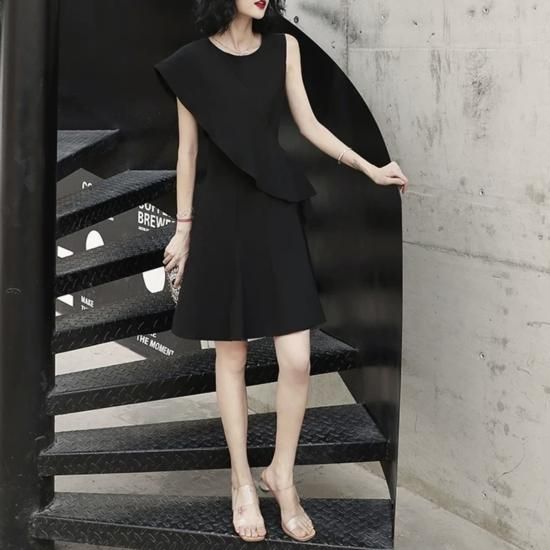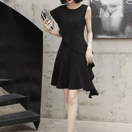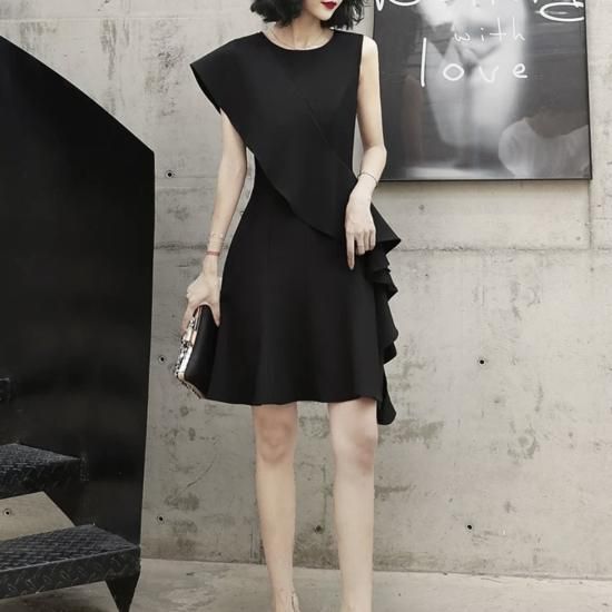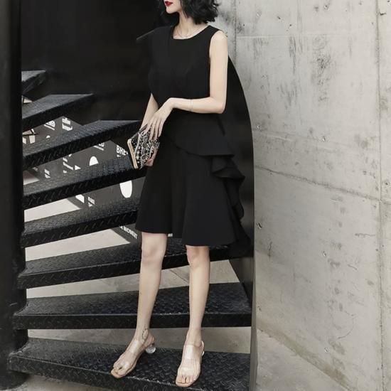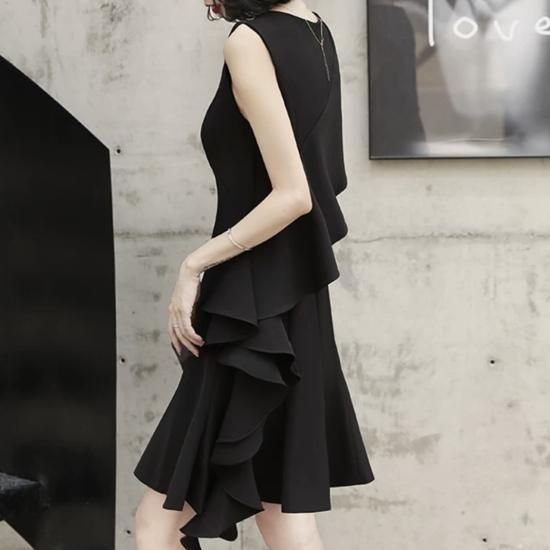ドレス ラウンドネック フリル ノースリーブ Aライン モダン エレガント シック モード お呼ばれ 結婚式 結婚式二次会 謝恩会 同窓会 記念日 ブラック