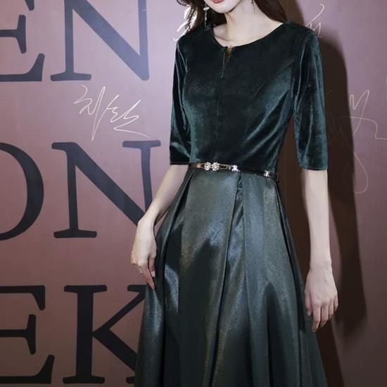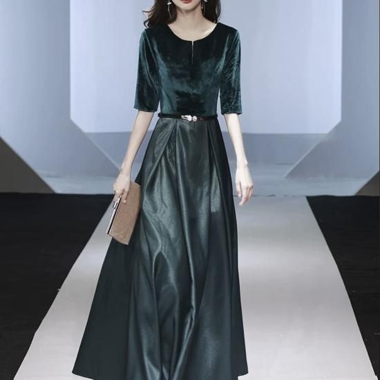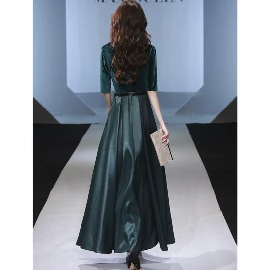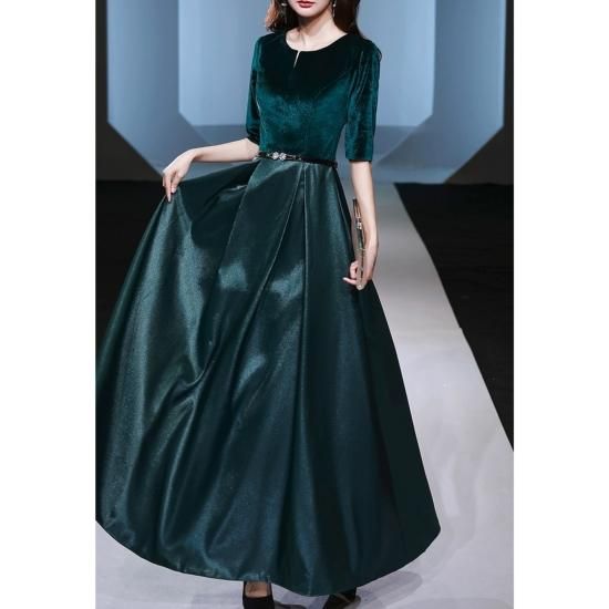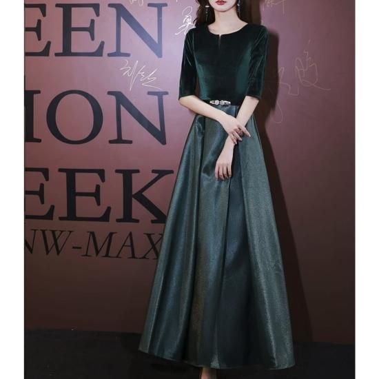 ロングドレス ベロア 光沢 サテン お呼ばれ 結婚式 二次会 演奏会 Aライン ラウンドネック 五分袖 ハイウエスト 露出控えめ 気品 エレガント グリーン系