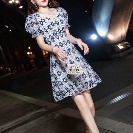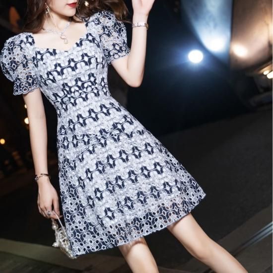 ドレス ボタニカル ペンタゴンネック パフスリーブ 半袖 ハイウエスト Aライン ミニ丈 キュート フェミニン クラシカル お呼ばれ 結婚式 結婚式二次会 記念日 同窓会 ブルー系