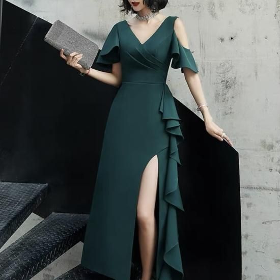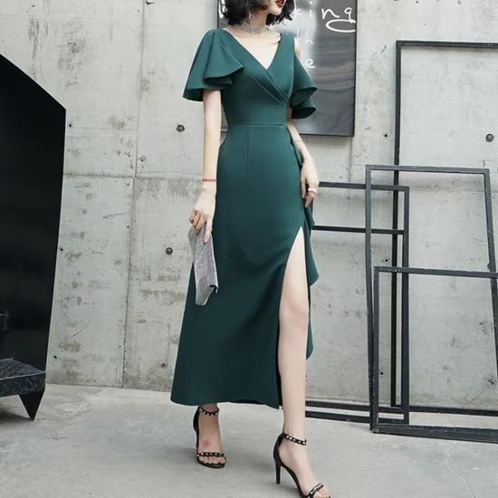 ドレス ミモレ丈 スリット ドレープ アシンメトリー Vネック カシュクール フレアスリーブ ショルダーカット スリム Aライン エレガント セクシー お呼ばれ 同窓会 結婚式二次会 グリーン系