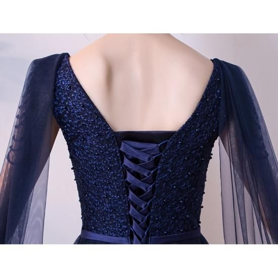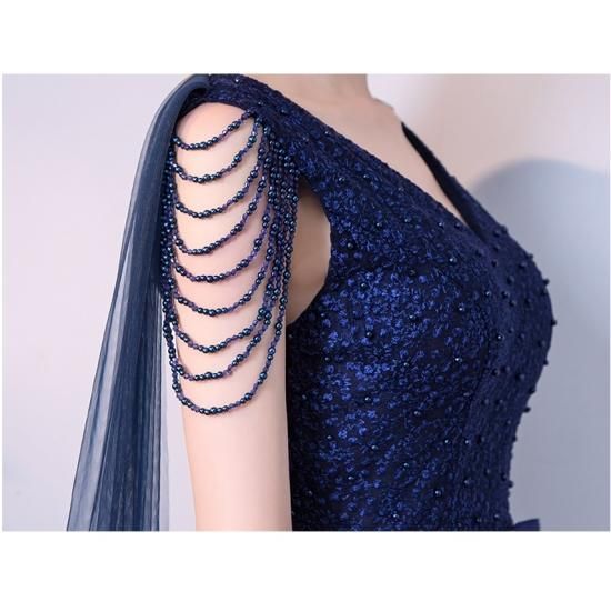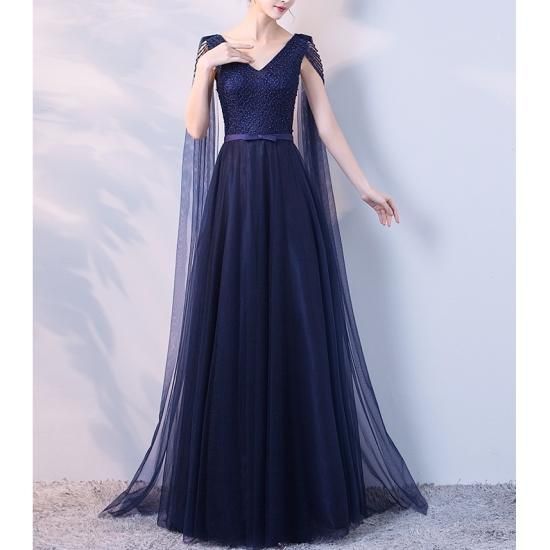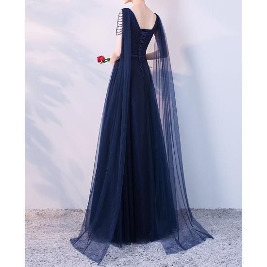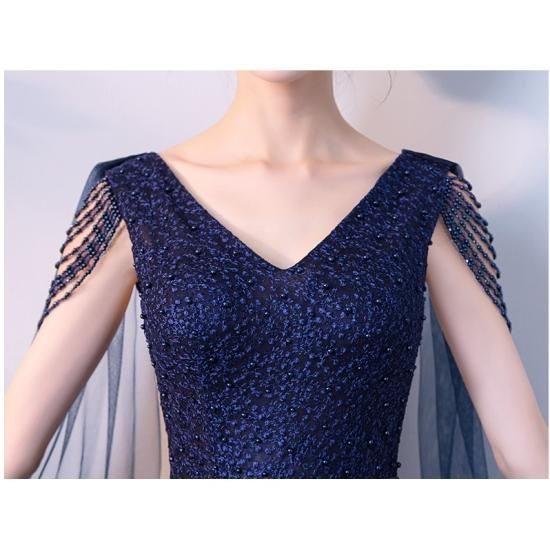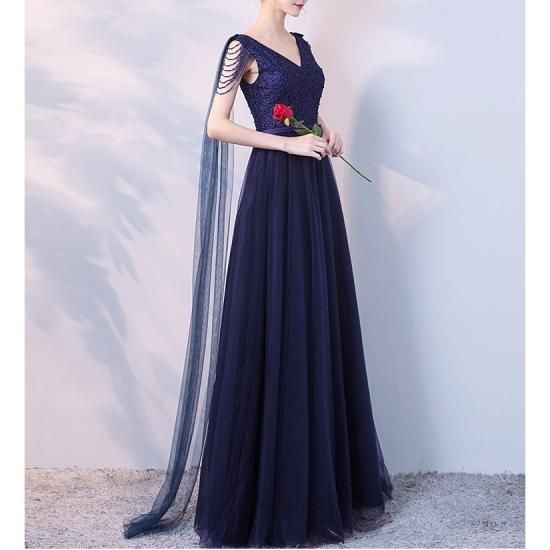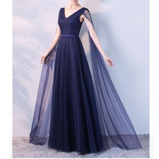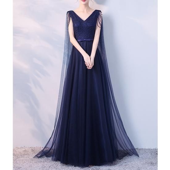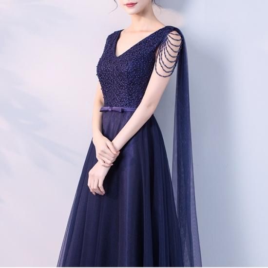 ドレス トレーン 肩トレーン ビーズ ブルー 青 ネイビー ロングドレス Vネック オーガンジー 発表会 演奏会 結婚式 二次会 お呼ばれ