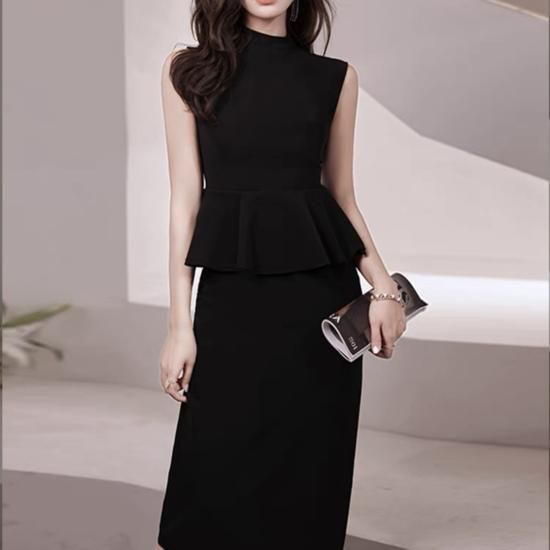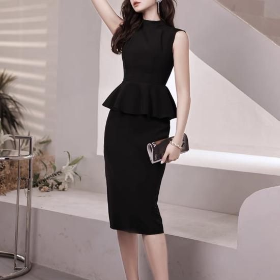 ドレス ハイネック ノースリーブ ペプラム ミモレ丈 大人 シンプル エレガント お呼ばれ 結婚式 謝恩会 同窓会 記念日 ブラック