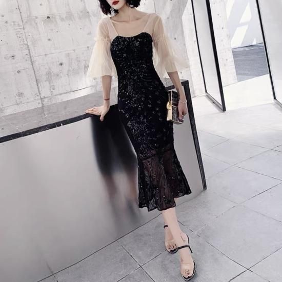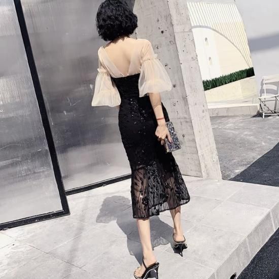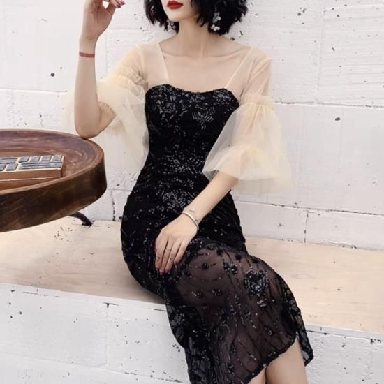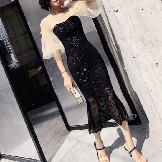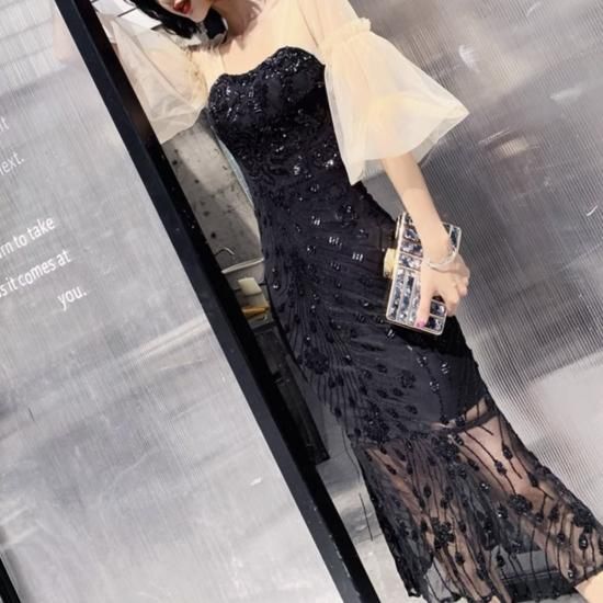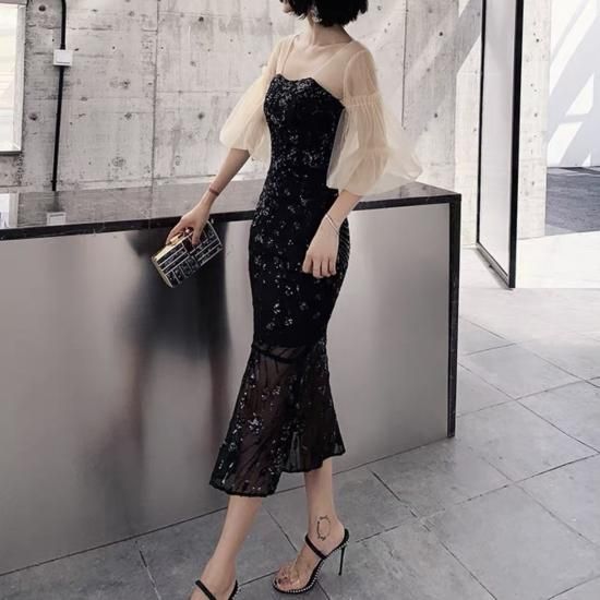 ドレス スクエアネック シアースリーブ パフスリーブ マーメイド スパンコール ミモレ丈 透け感 バックオープン エレガント フェミニン お呼ばれ 結婚式 結婚式二次会 謝恩会 ブラック
