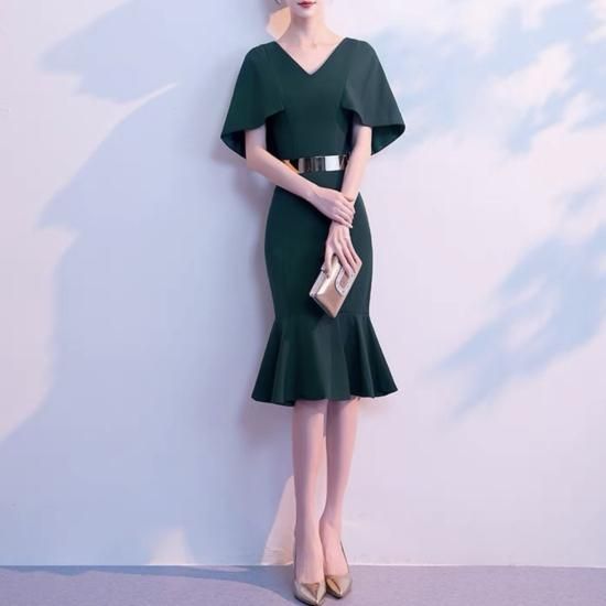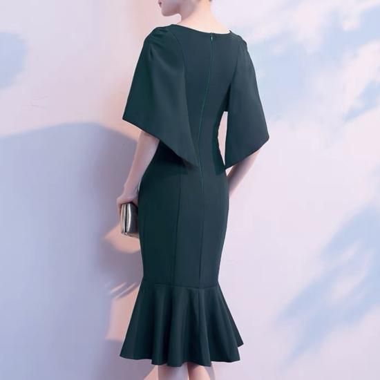 落ち着いたグリーンカラーにマーメイドシルエットが大人のエレガントさを演出するミディアムドレス。