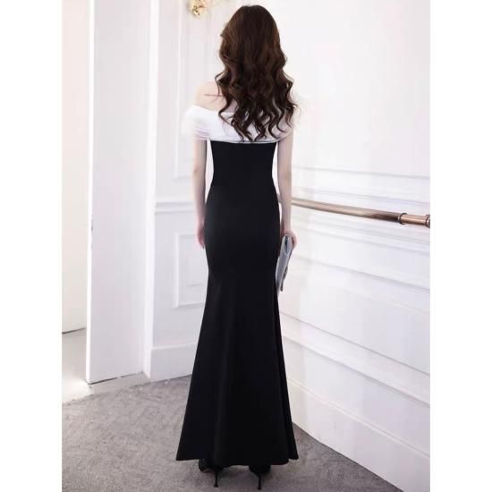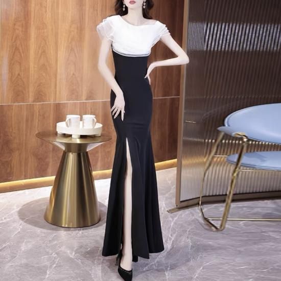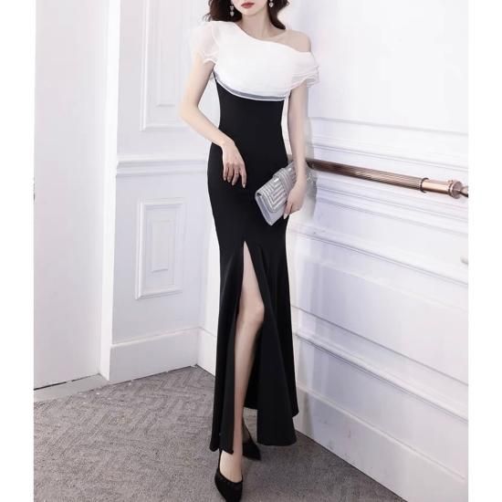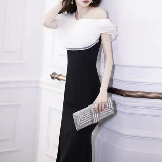 ドレス ロングドレス フレスリーブ バイカラー モノトーン ワンショルダー マーメイド スリム スリット シンプル 気品 大人 エレガント お呼ばれ 結婚式 同窓会 演奏会 ブラック