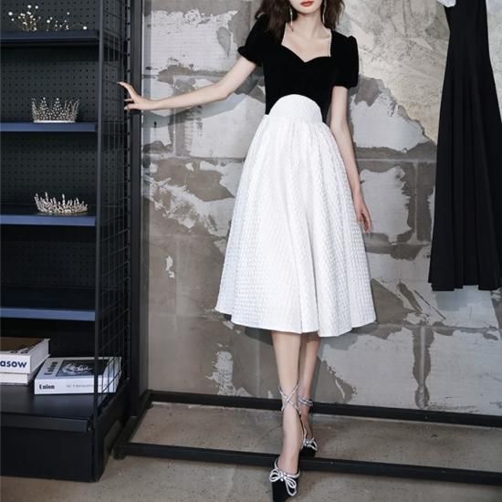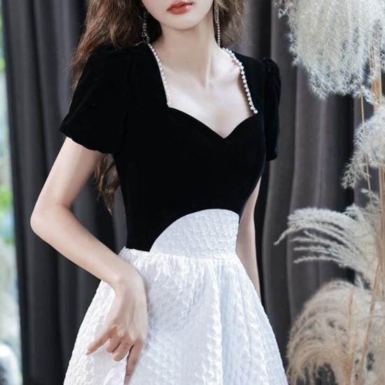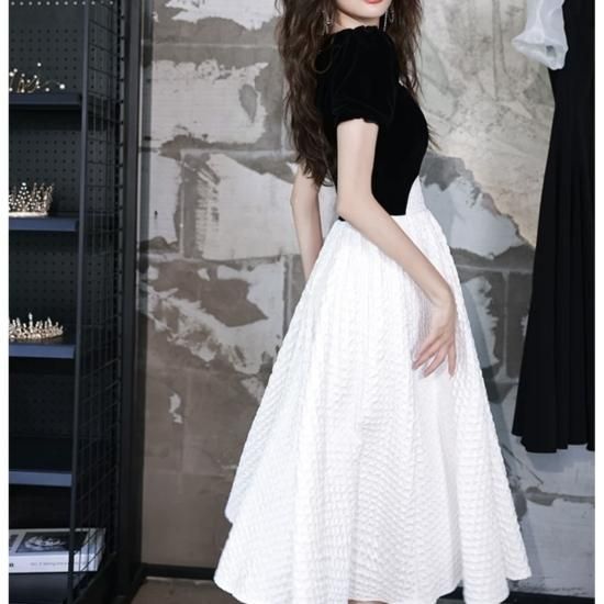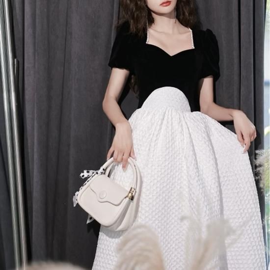 ドレス ベロア ワッフル生地 ペンタゴンネック 半袖 パフスリーブ Aライン フレア ミモレ丈 パール 上品 クラシカル お呼ばれ 結婚式 結婚式二次会 同窓会 ブラック系 ホワイト系