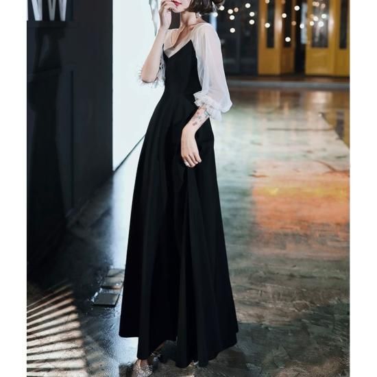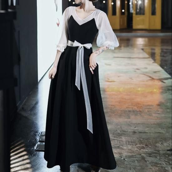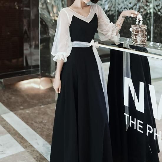 ドレス ロングドレス Vネック 七分袖 シアースリーブ 透け感 Aライン フレア ウエストリボン 上品 大人 シンプル 露出控えめ お呼ばれ 結婚式 結婚式二次会 謝恩会 同窓会 ブラック