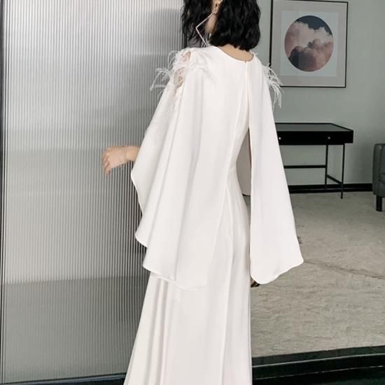 ドレス ロングドレス Vネック フレアスリーブ ショルダーカット エレガント シンプル 気品 クール お呼ばれ 結婚式 結婚式二次会 同窓会 ホワイト