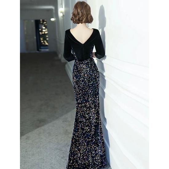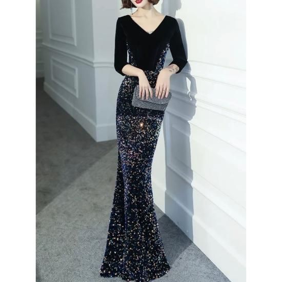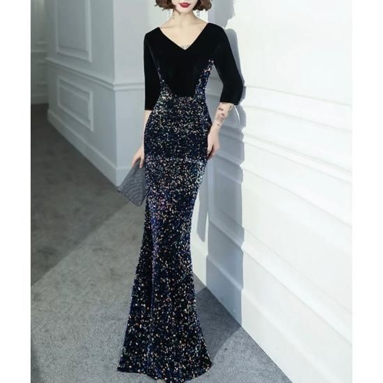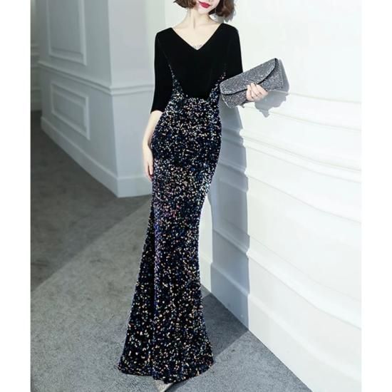ドレス ロングドレス イブニングドレス 五分袖 Vネック マーメイド スパンコール 煌めき ゴージャス ベルベット エレガント お呼ばれ 結婚式 演奏会 ネイビー