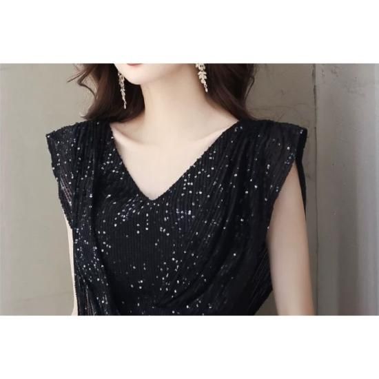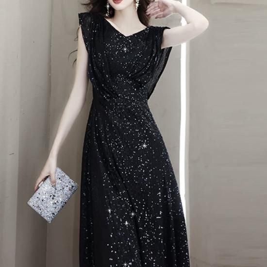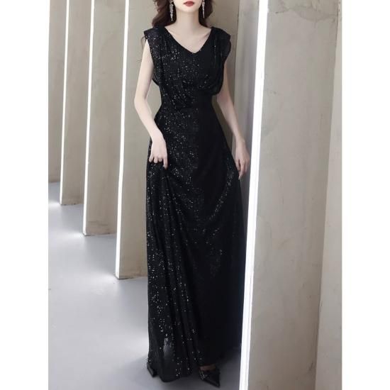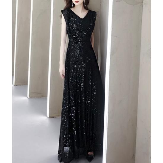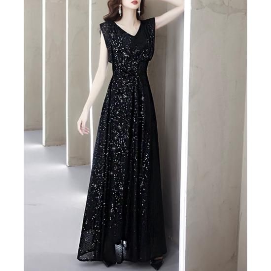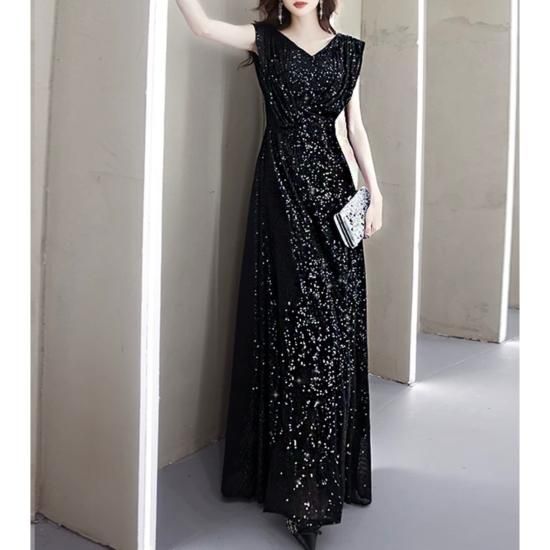 ドレス ロングドレス イブニングドレス Vネック ノースリーブ Aライン 煌めき スパンコール エレガント ゴージャス シック 大人 お呼ばれ 結婚式 謝恩会 演奏会 ブラック