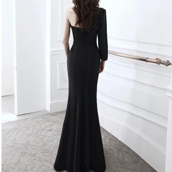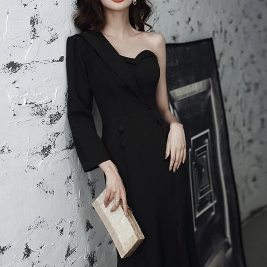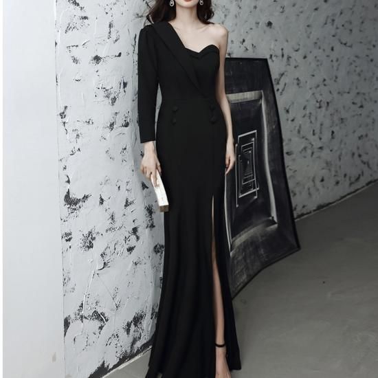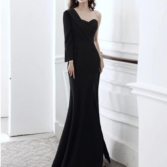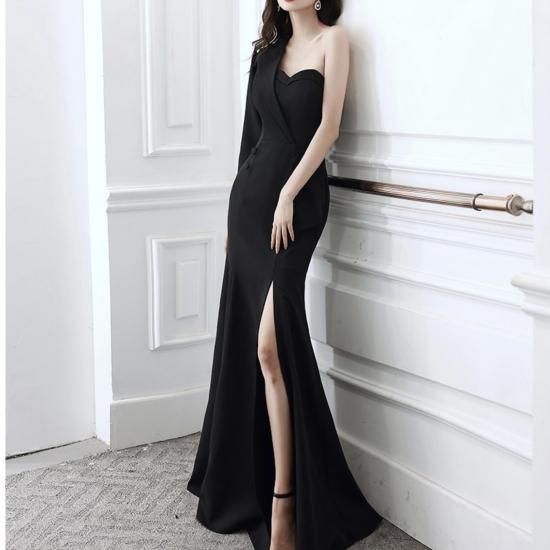 ドレス ロングドレス マーメイド ワンショルダー ビスチェ アシンメトリー スリット入り エレガント シック クール 気品 お呼ばれ 結婚式 演奏会 ブラック