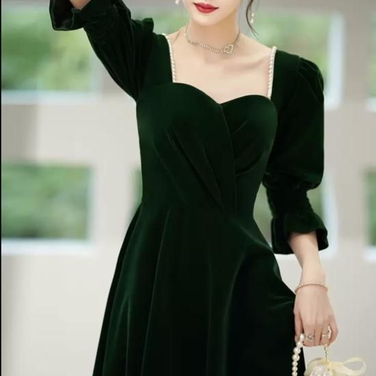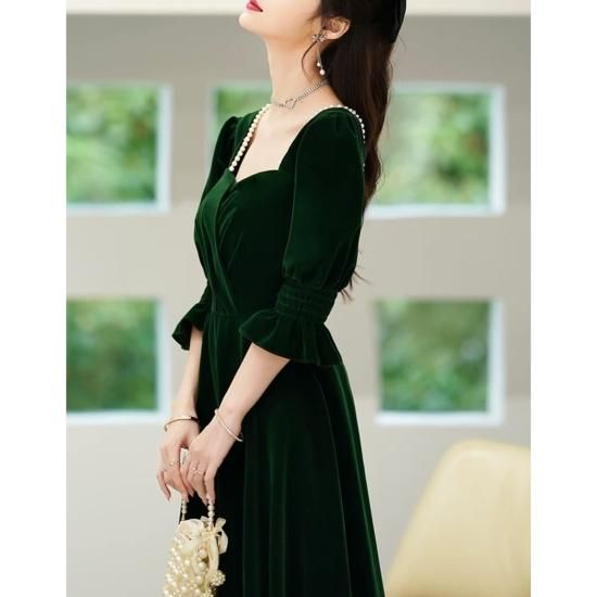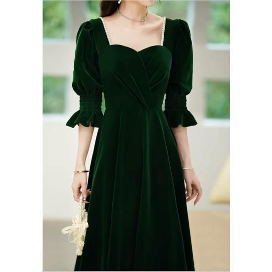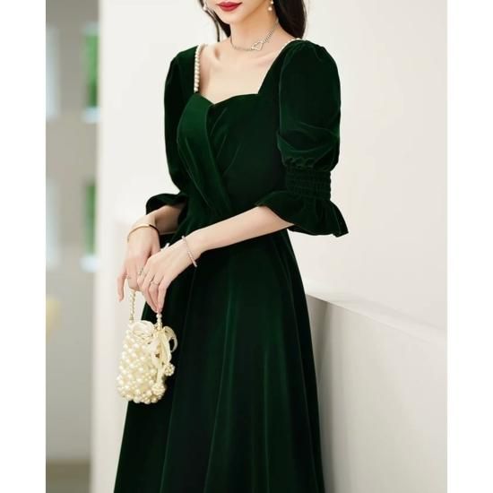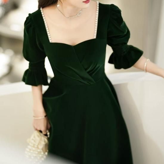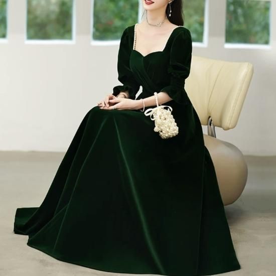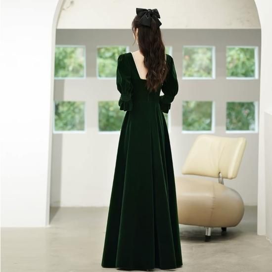 ドレス ロングドレス カラードレス ベルベット ペンタゴンネック パール 七分袖 パフスリーブ Aライン ハイウエスト バックオープン エレガント 気品 華やか お呼ばれ 結婚式 演奏会 グリーン系