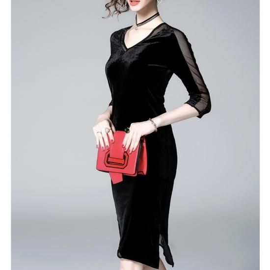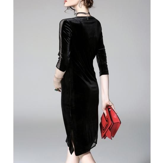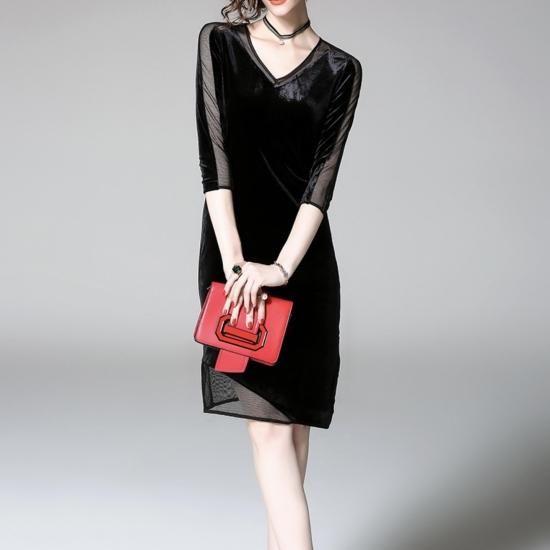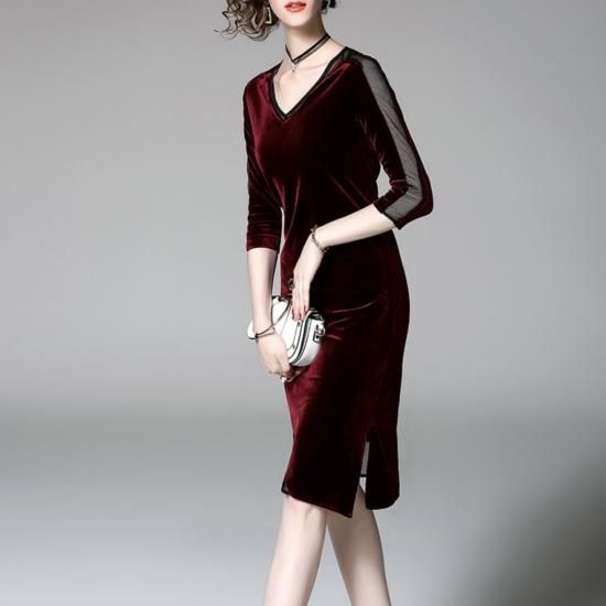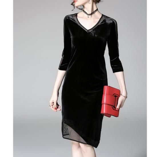 ドレス ベルベット Vネック 七分袖 膝丈 シアースリーブ 透け感 エレガント 上品 シンプル 大人露出控えめ タイト スリム お呼ばれ 結婚式 謝恩会 記念日 発表会 ブラック ボルドー