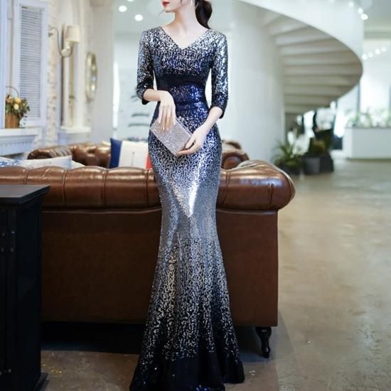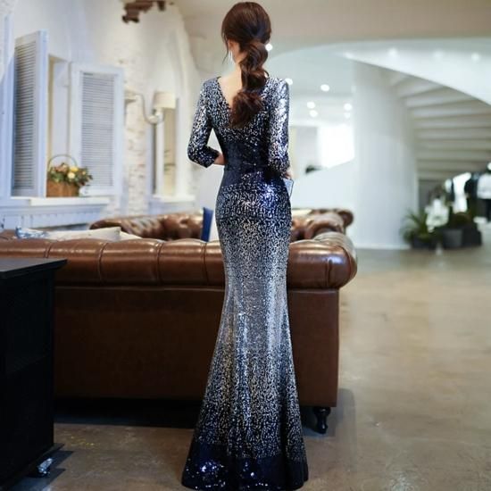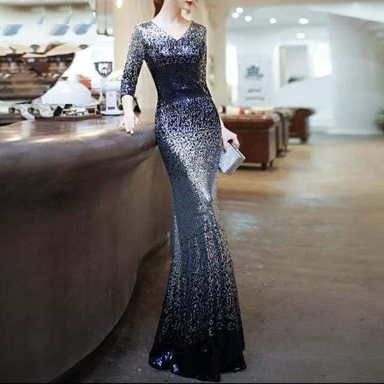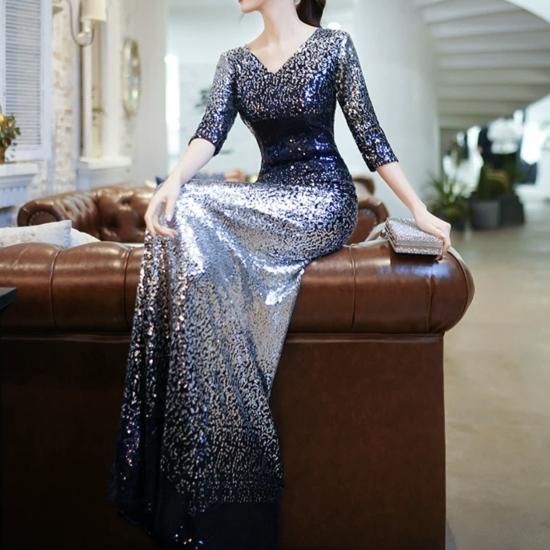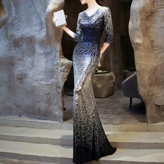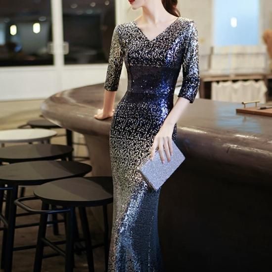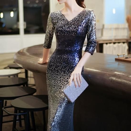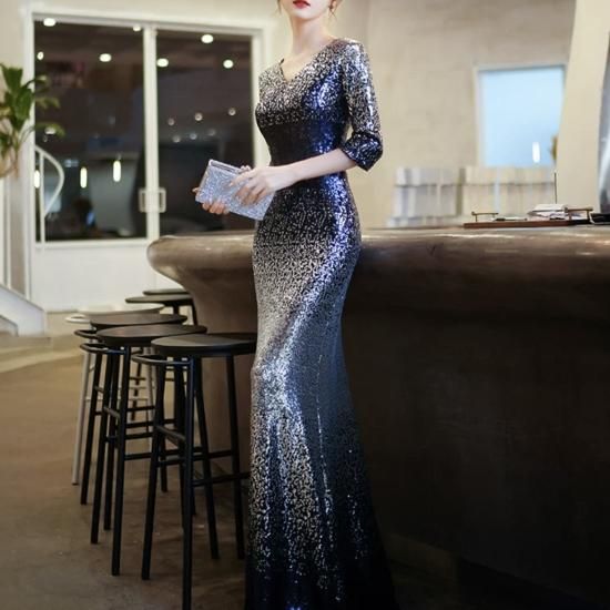 ドレス ロングドレス イブニングドレス 煌めき スパンコール ゴージャス Vネック 七分袖 グラデーション エレガント タイト スリム マーメイド お呼ばれ 演奏会 ブルー系