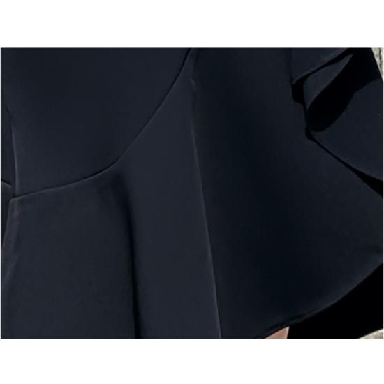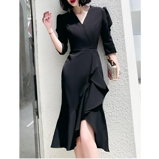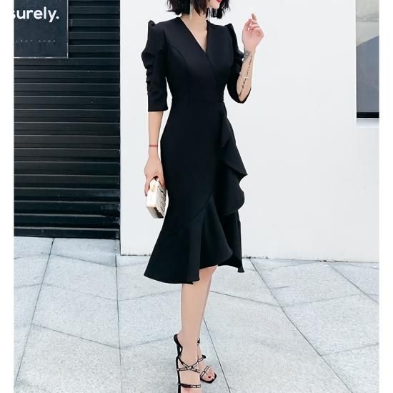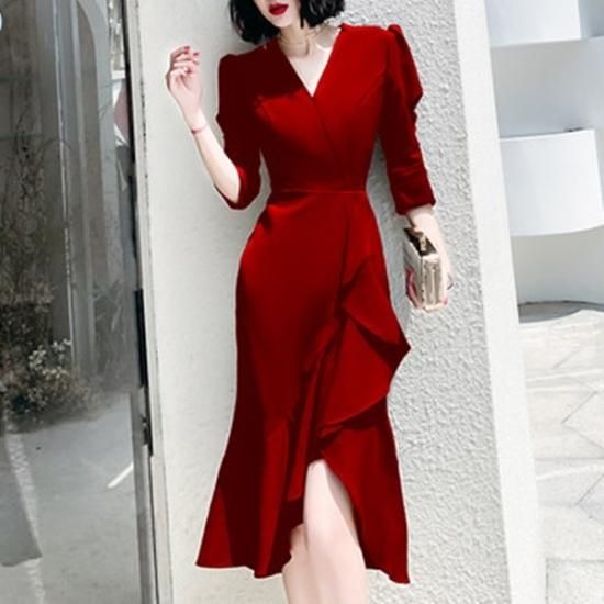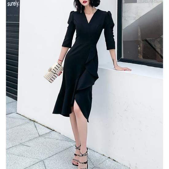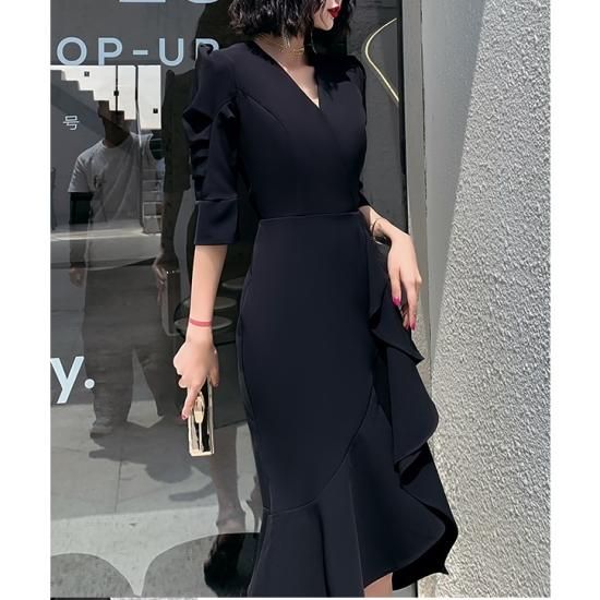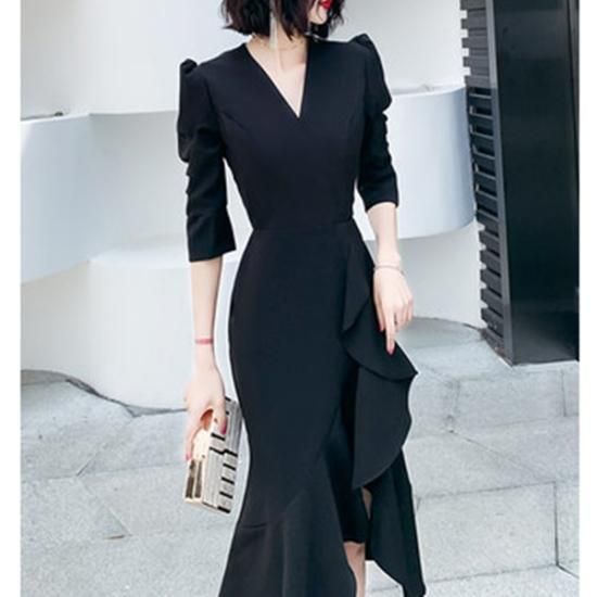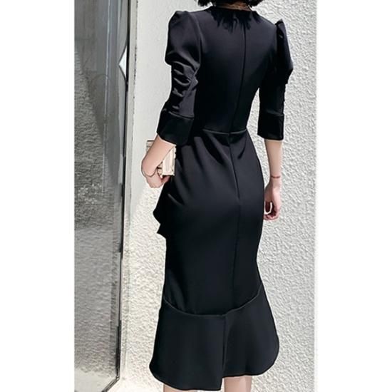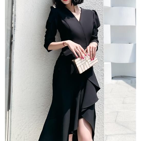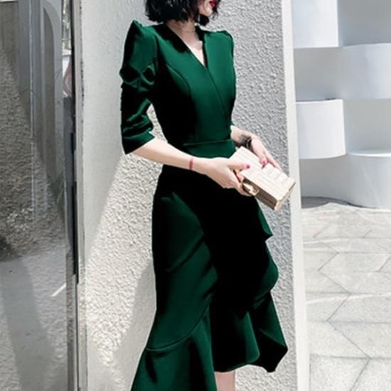 ドレス ワンピース パフスリーブ パワーショルダー Vネック タイト フリル マーメイド エレガント 上品 パーティー 結婚式 二次会 お呼ばれ
