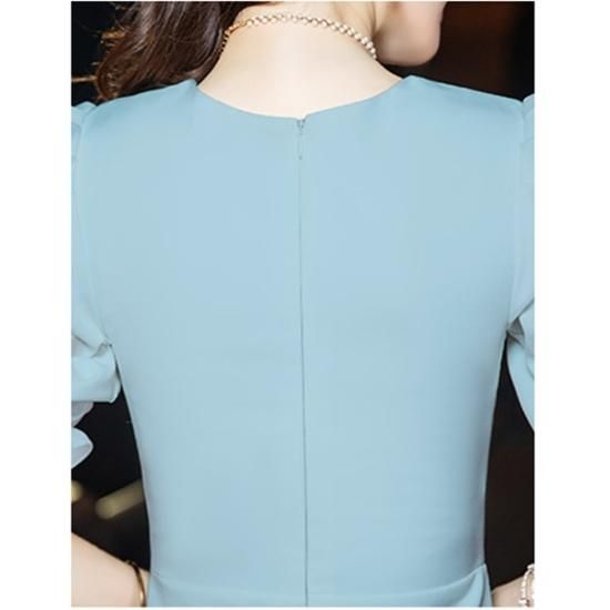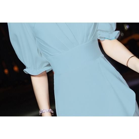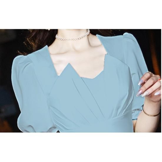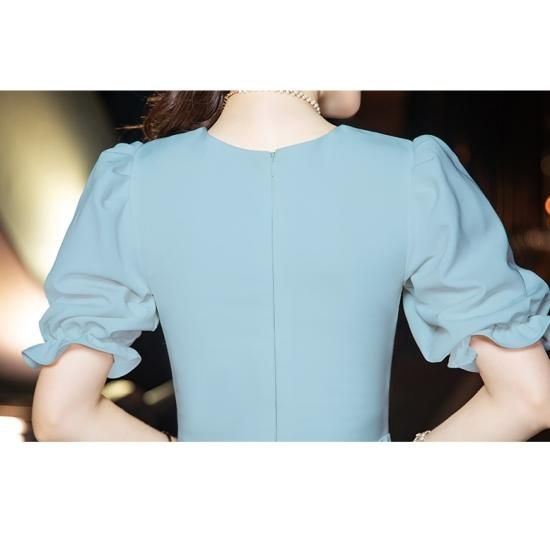 ドレス ワンピース ブルー 水色 パフスリーブ フリル タイト マーメイド フィッシュテール パーティー 結婚式 二次会 お呼ばれ