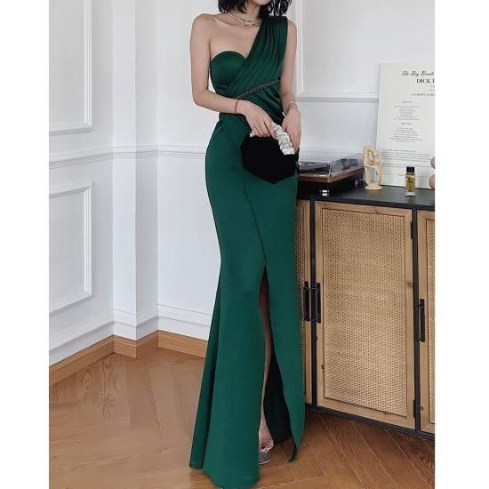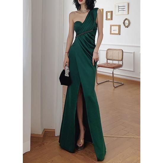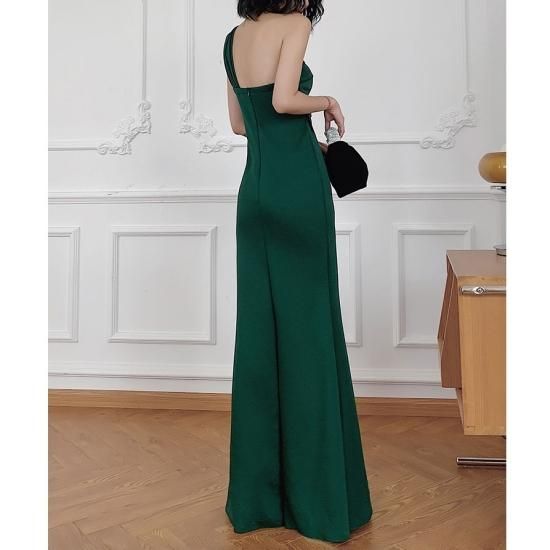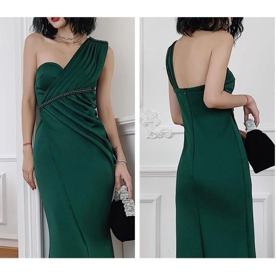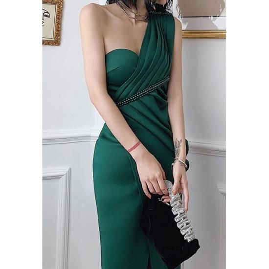 ドレス ワンピース グリーン 緑 ワンショルダー ドレープ ギャザー ハイウエスト 演奏会 パーティー エレガント お呼ばれ