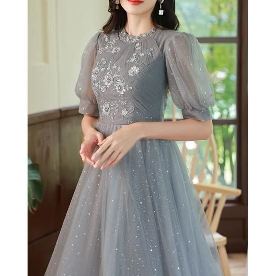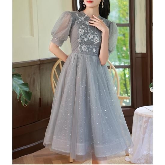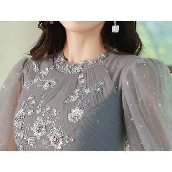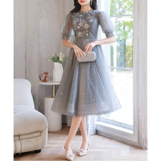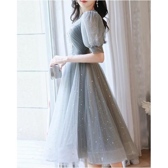 ドレス ワンピース ブルー 青 水色 キラキラ 刺繍 パフスリーブ オーガンジー フレア プリンセス パーティー 結婚式 二次会 お呼ばれ