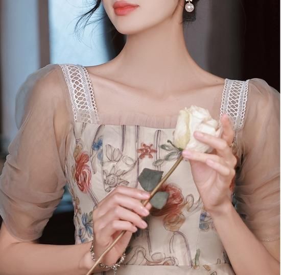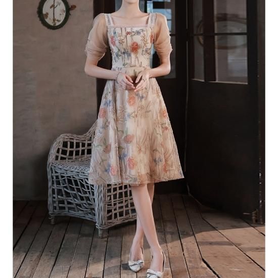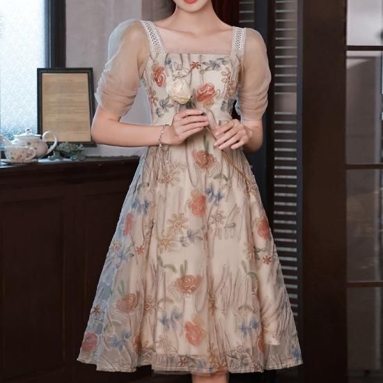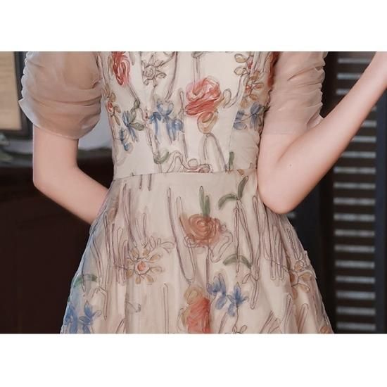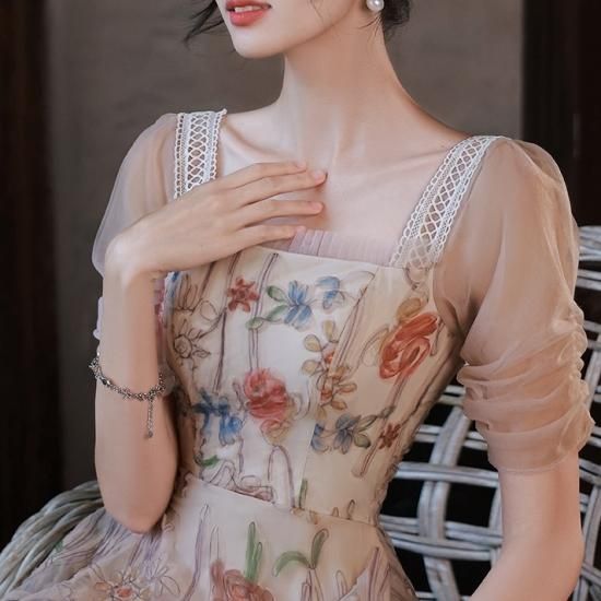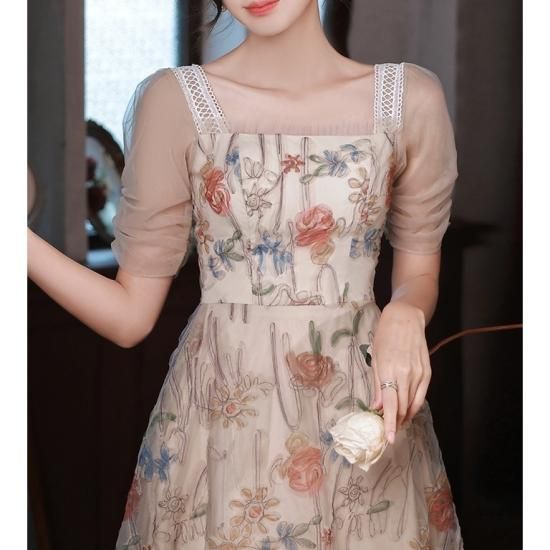 ドレス ワンピース 花柄 オーガンジー 刺繍 スクエアネック チュール 透け感 パーティー お呼ばれ