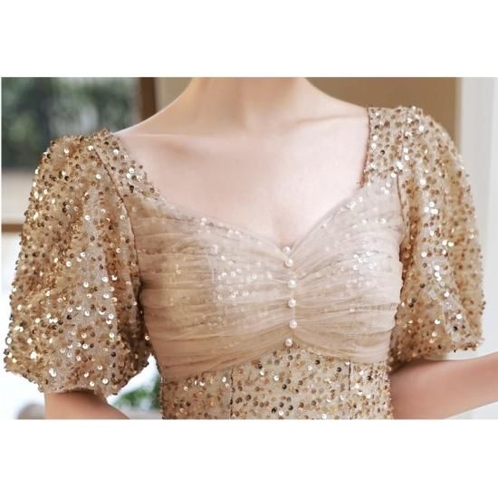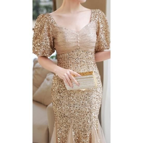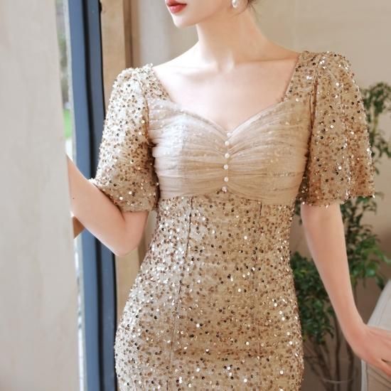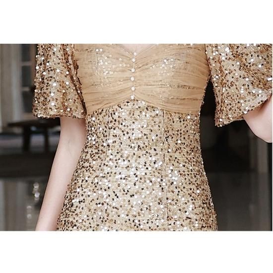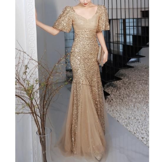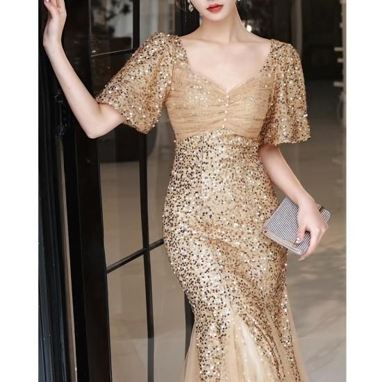 ドレス ワンピース ゴールド キラキラ シャイニー マーメイド 半袖 ロングドレス パーティー 演奏会 発表会 結婚式 二次会