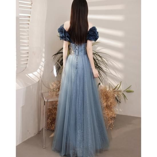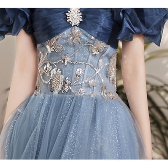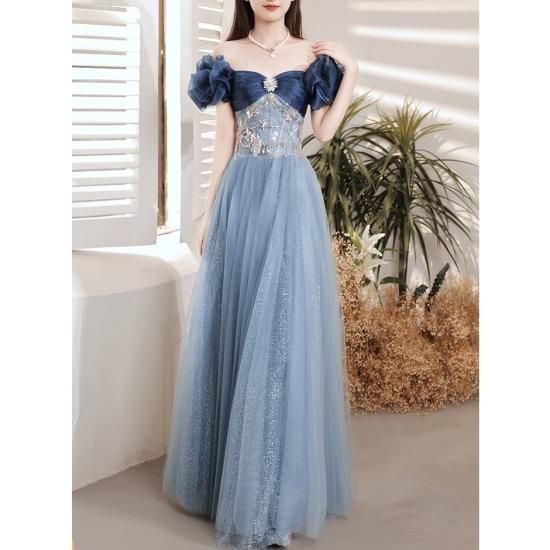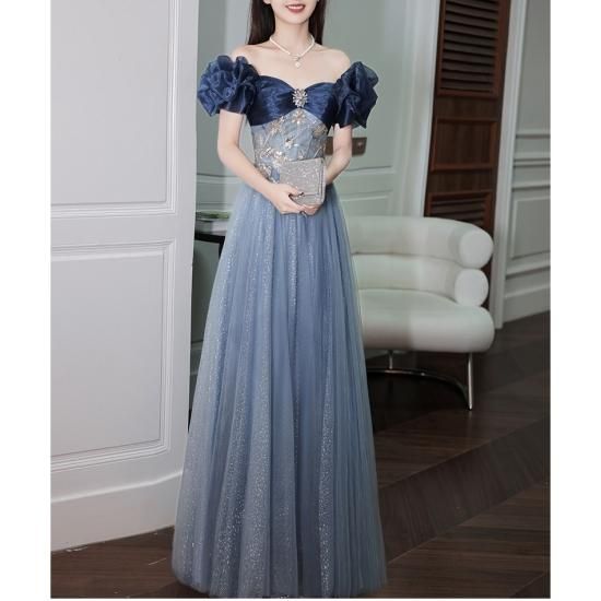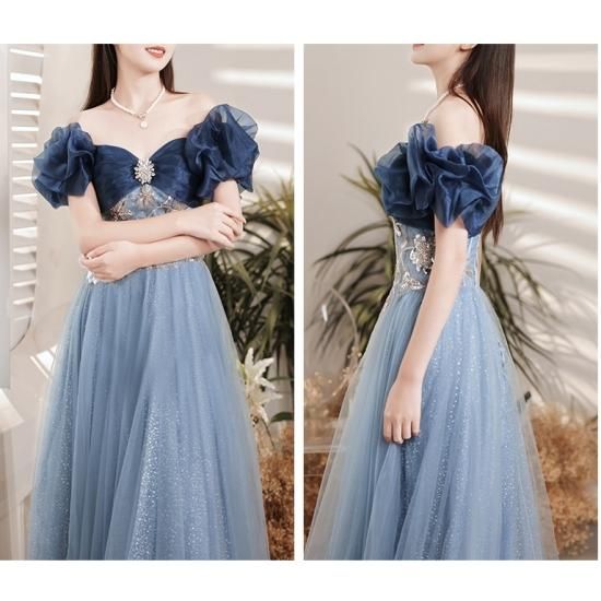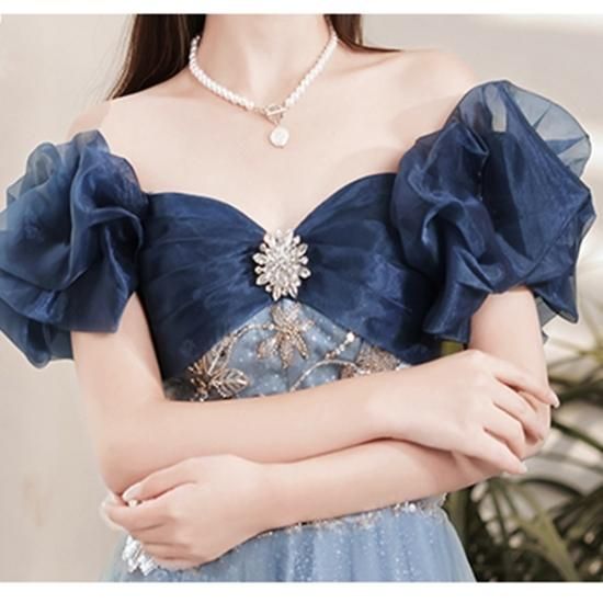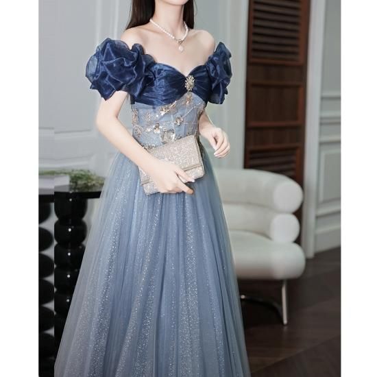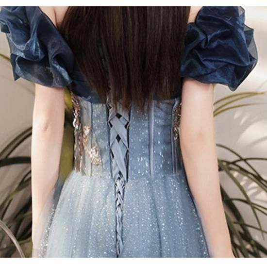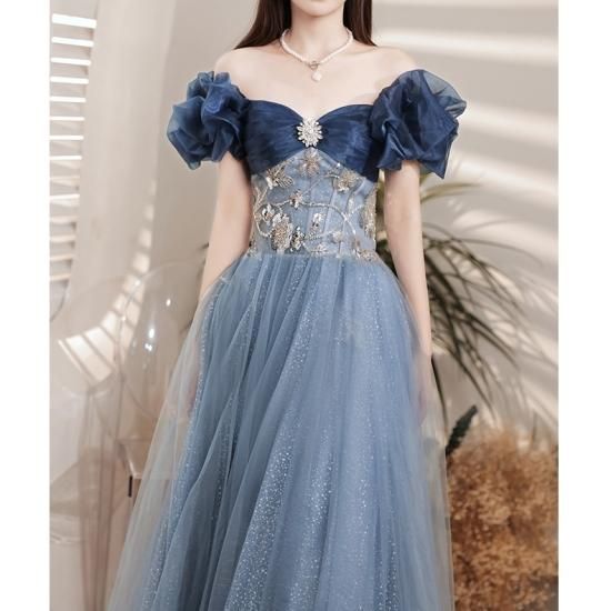 ドレス ワンピース 青 ブルー プリンセス パフスリーブ フリル オーガンジー オフショルダー チュール キラキラ パーティー 前撮り 結婚式 二次会