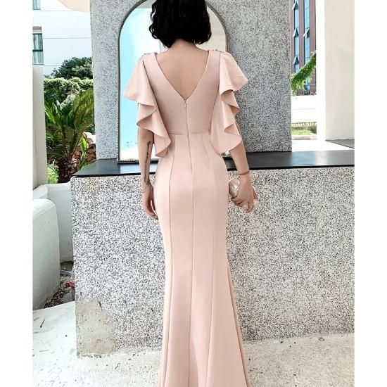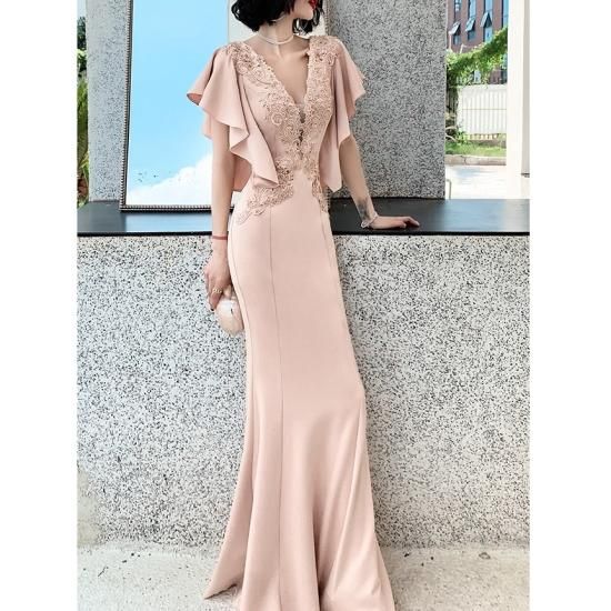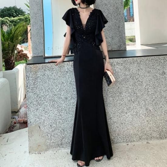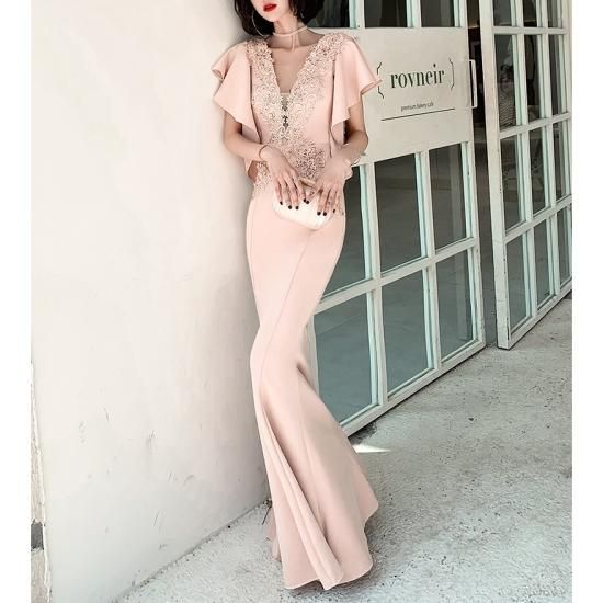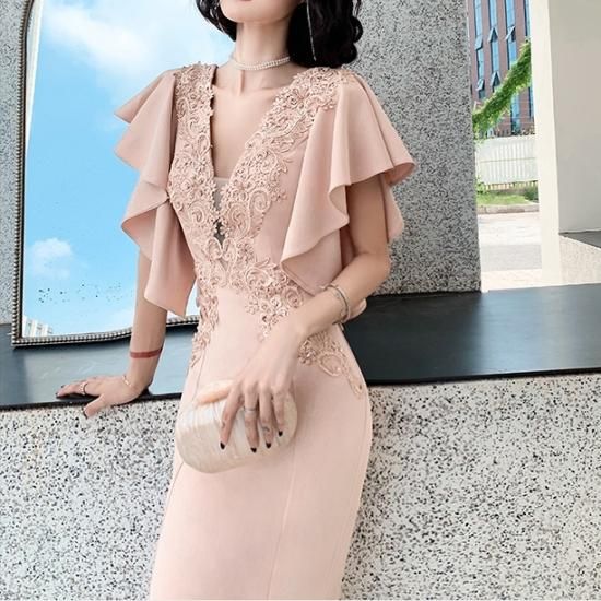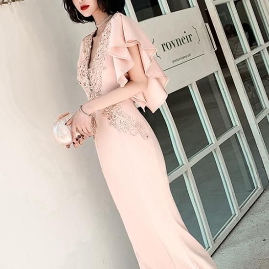 ドレス ワンピース ロングドレス フリル 半袖 ブラック ピンク 刺繍 フリル エレガント マーメイド パーティー 結婚式 二次会 お呼ばれ