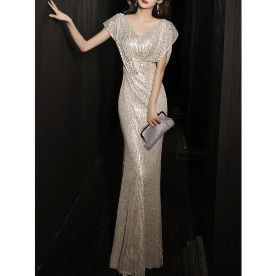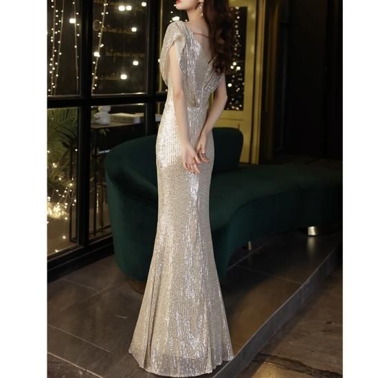 煌めくスパンコール刺繍がゴージャスな雰囲気を演出するロングドレス。