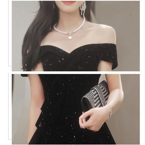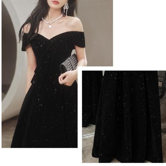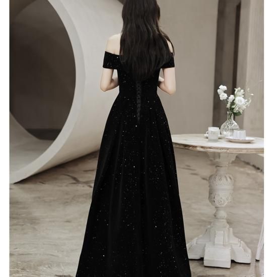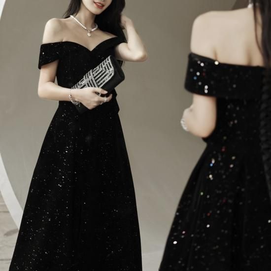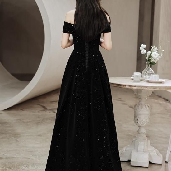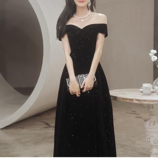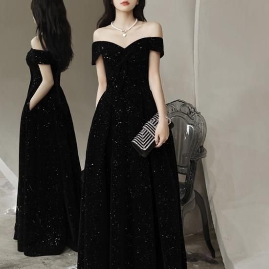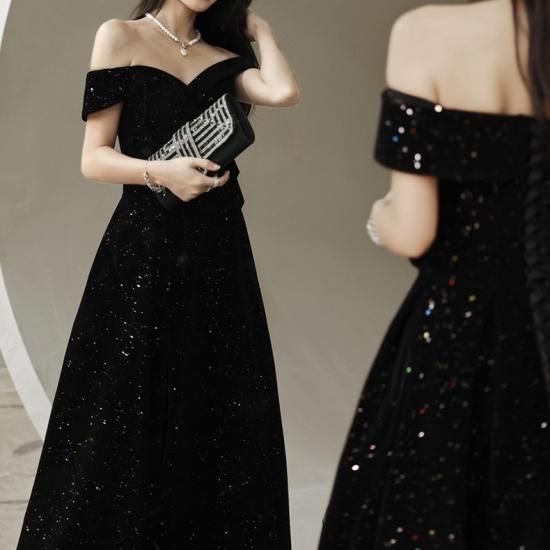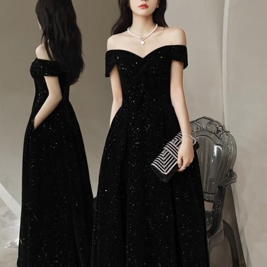 ドレス ロングドレス イブニングドレス カラードレス オフショルダー Aライン ラメ加工 エレガント 上品 大人 結婚式 二次会 お色直し 演奏会 ブラック