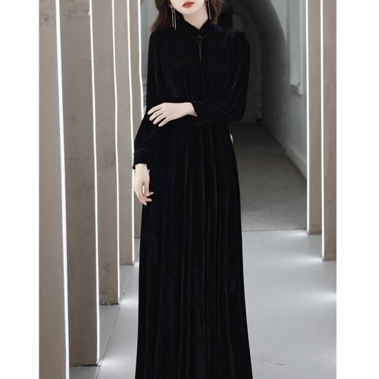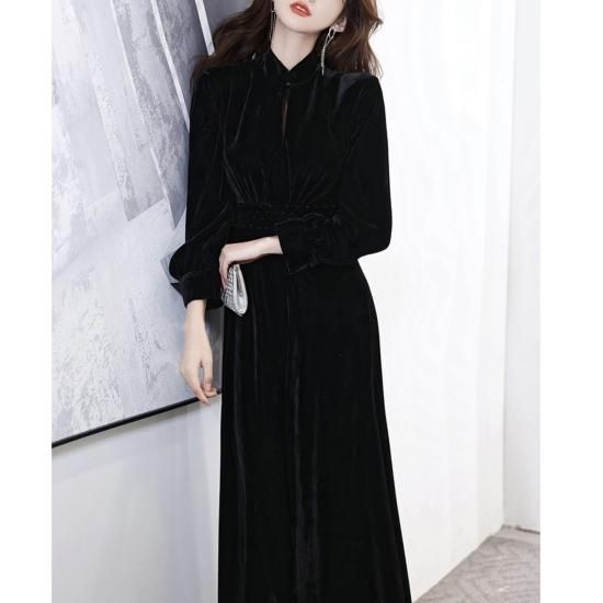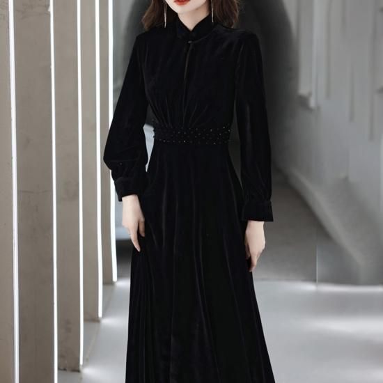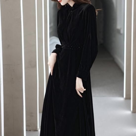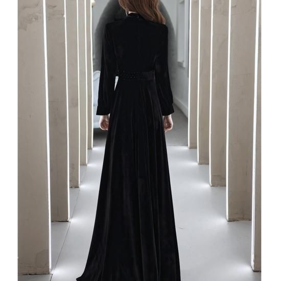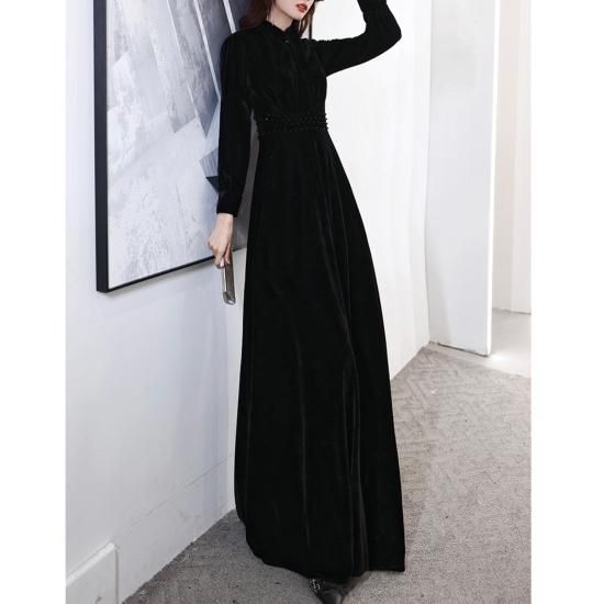 ドレス ロングドレス ベルベット スタンドカラー 長袖 パフスリーブ ハイウエスト Aライン 大人 露出控えめ 気品 エレガント お呼ばれ 結婚式 発表会 ブラック
