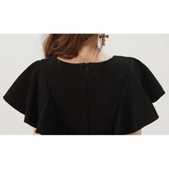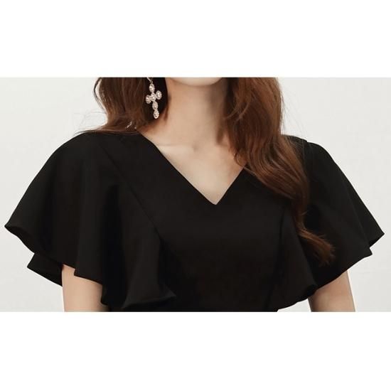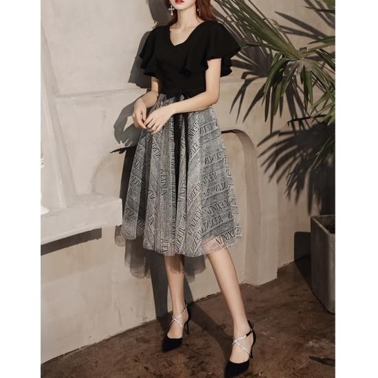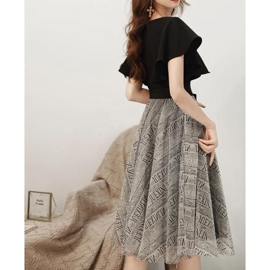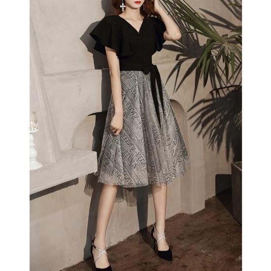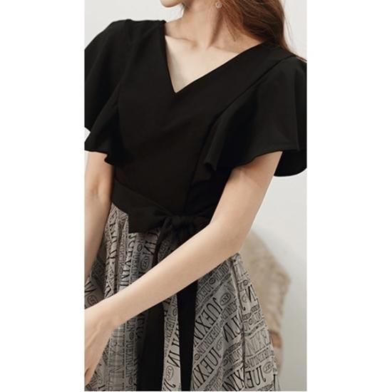 ドレス ワンピース 黒 ブラック フリル 切り替え フレア リボン 英字 半袖 Vネック パーティー お呼ばれ
