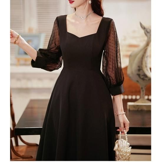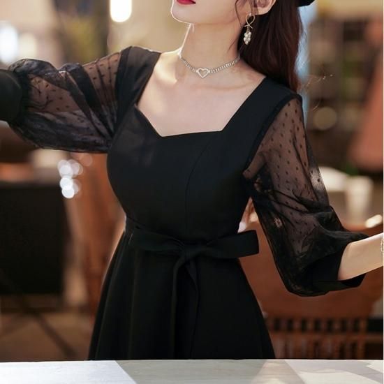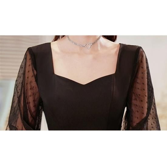 ドレス ワンピース 黒 ブラック シースルー ハートネック ドット フレア クラシカル パーティー 結婚式 二次会 お呼ばれ