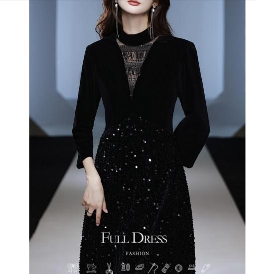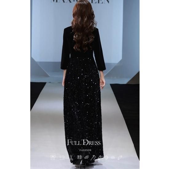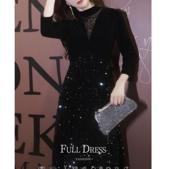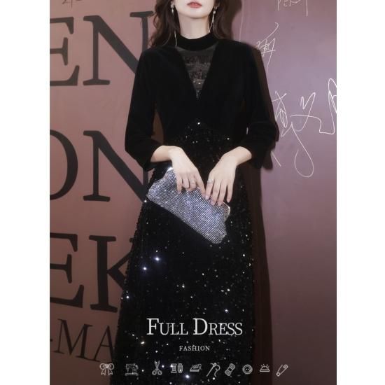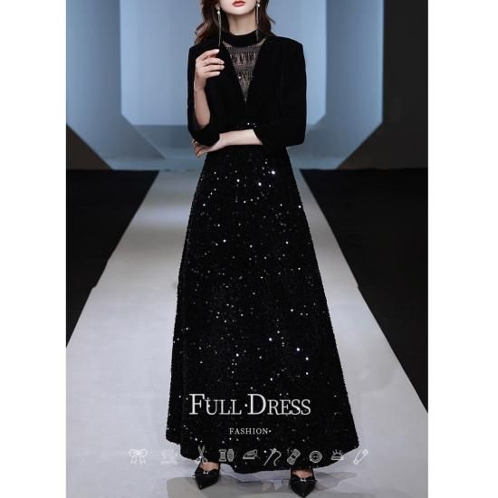 ドレス ロングドレス イブニングドレス 煌めき ゴージャス スパンコール 七分袖 ハイウエスト Aライン エレガント 大人 気品 お呼ばれ 結婚式 二次会 演奏会 ブラック