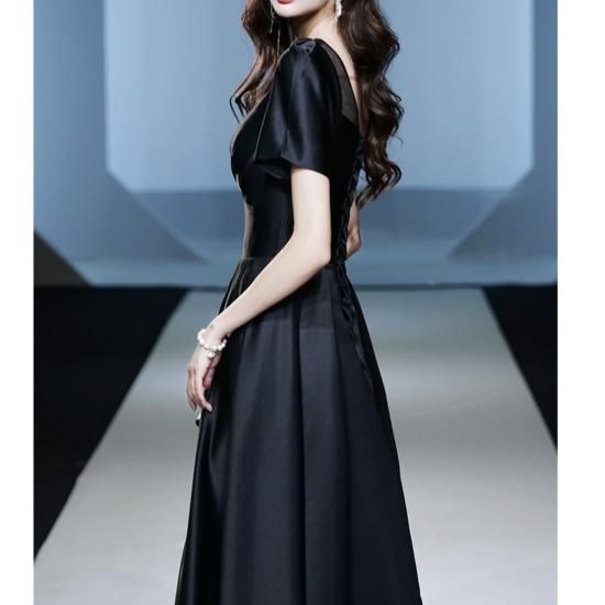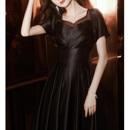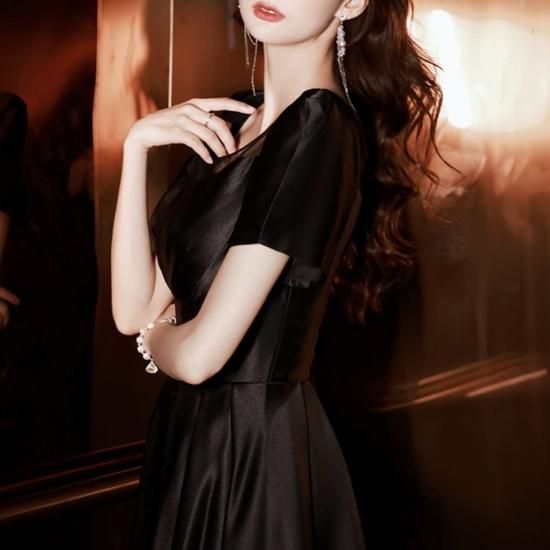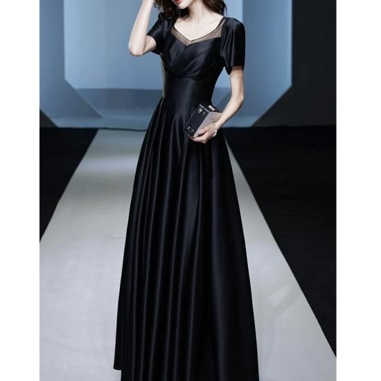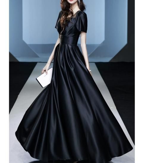 ドレス ロングドレス ペンタゴンネック 半袖 Aライン ハイウエスト 光沢 艶感 お呼ばれ 結婚式 二次会 謝恩会 気品 シンプル エレガント 大人 露出控えめ ブラック