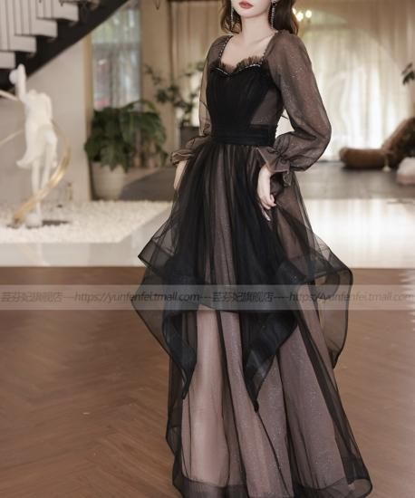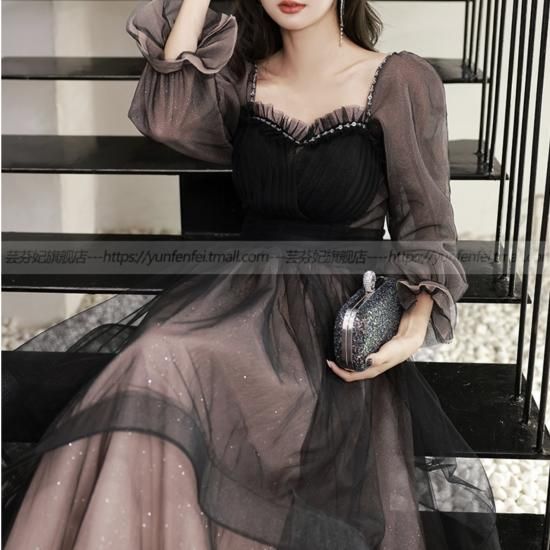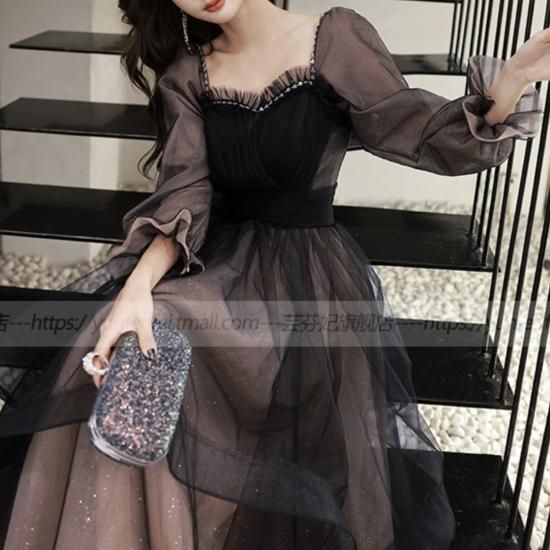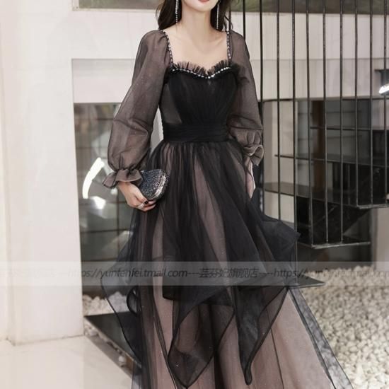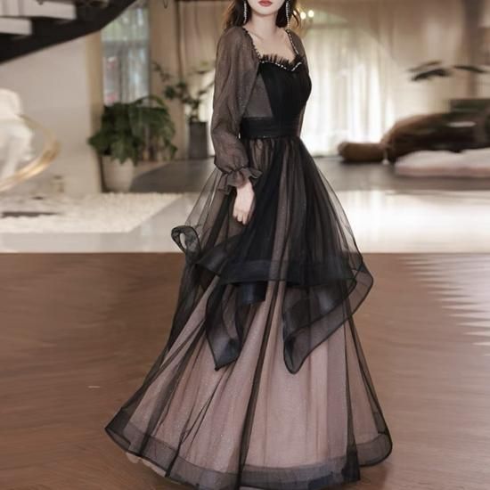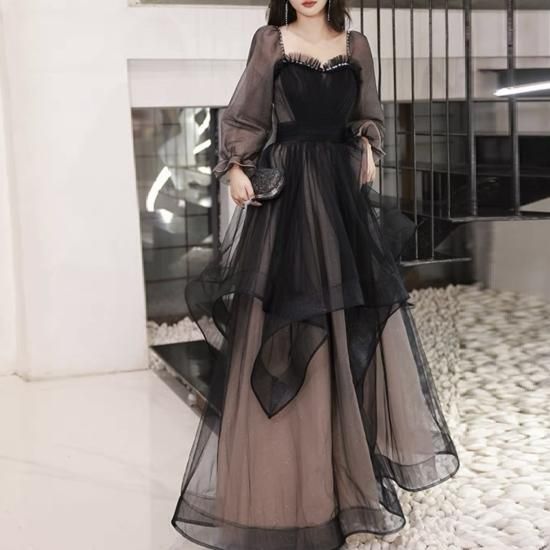 ドレス ロングドレス カラードレス ペンタゴンネック 長袖 シアースリーブ ハイウエスト Aライン 高貴 優雅 上品 結婚式 二次会 お色直し 演奏会 ブラック