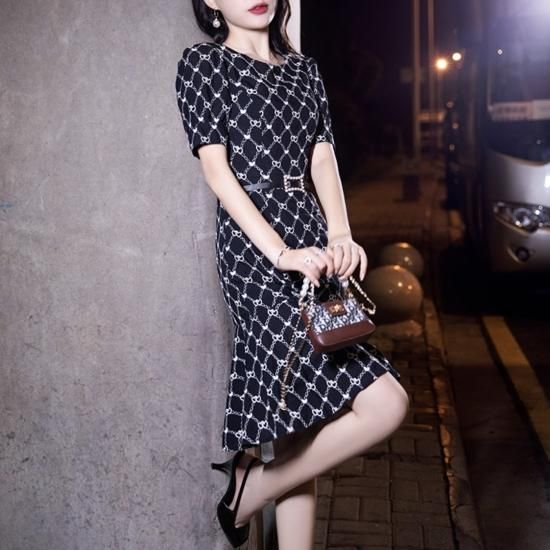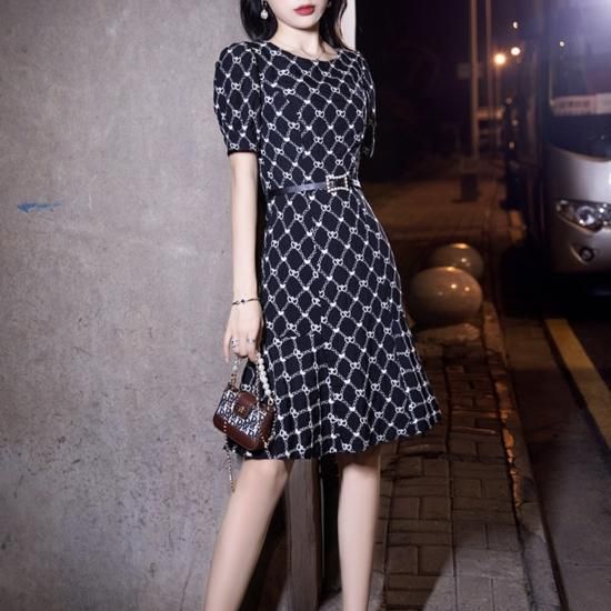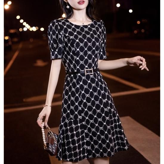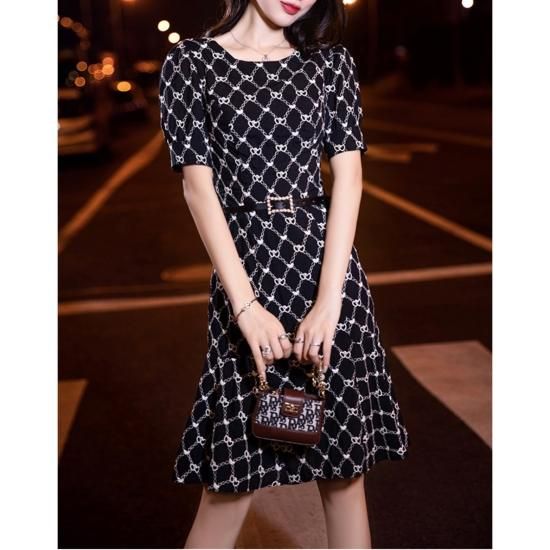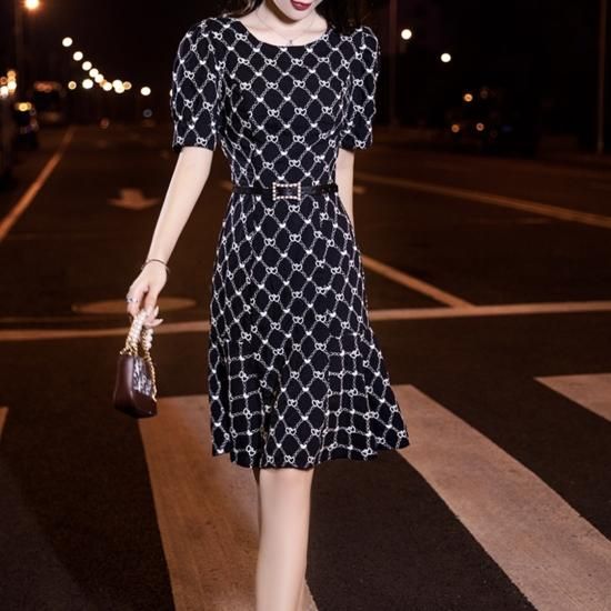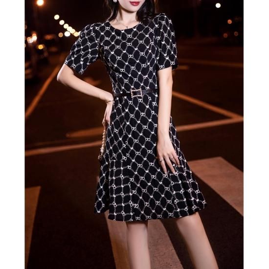 ドレス ラウンドネック 半袖 パフスリーブ ベルト付き チェーン柄 エレガント 上品 気品 フレア Aライン 膝丈 お呼ばれ 結婚式 二次会 記念日 ブラック