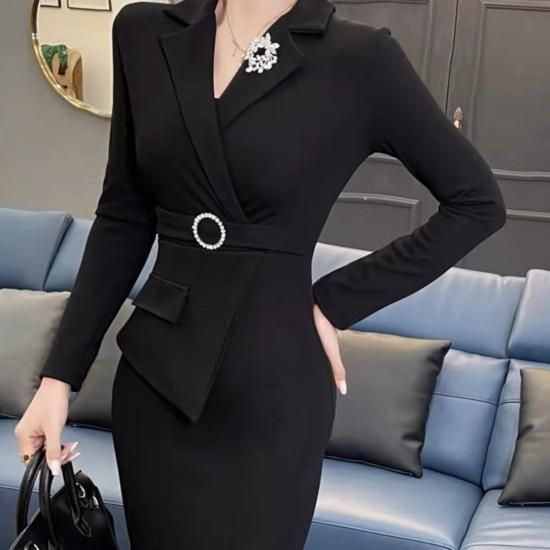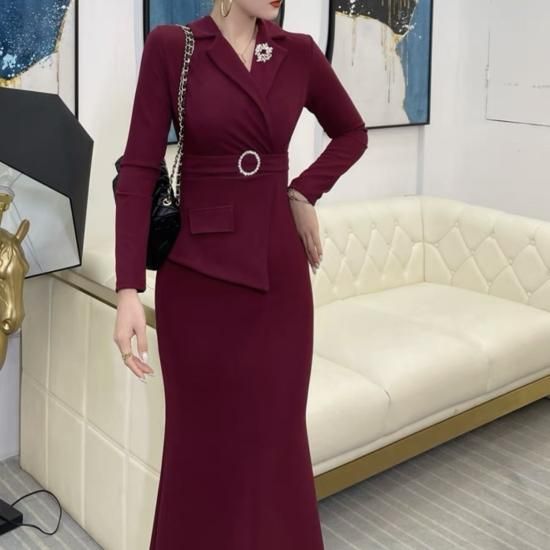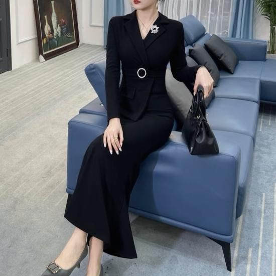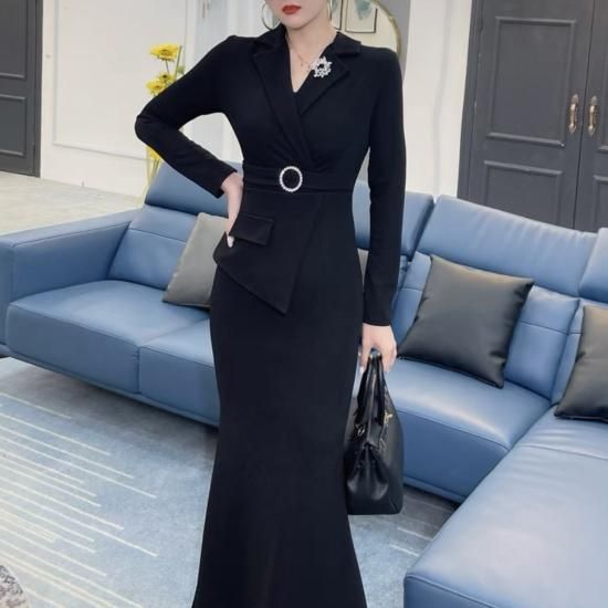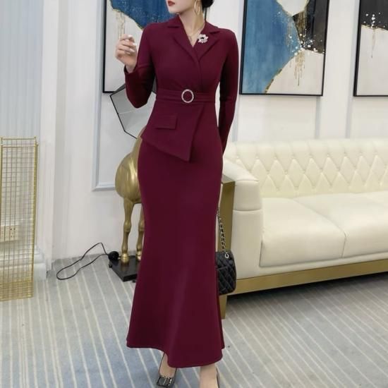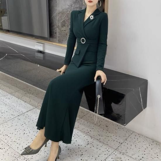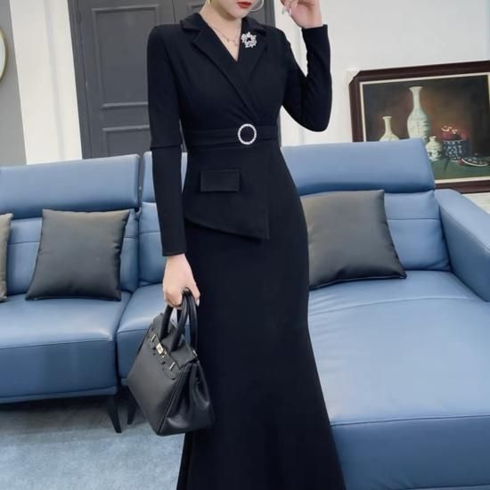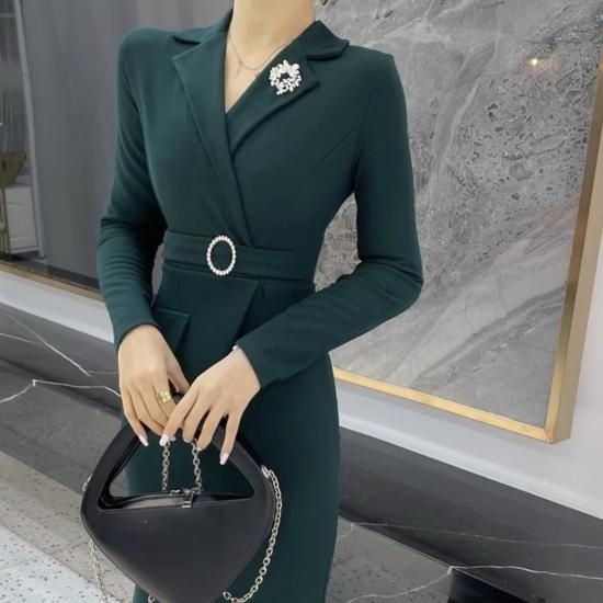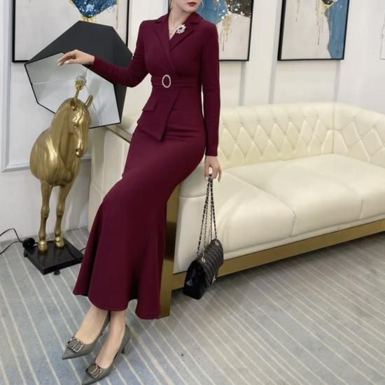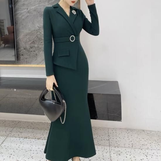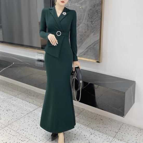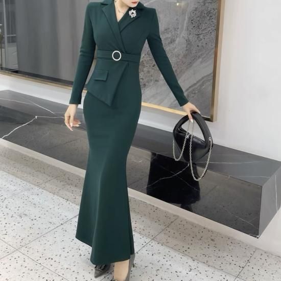 ドレス テーラードカラー 長袖 ハイウエスト マーメイド 美シルエット 大人 エレガント 上品 お呼ばれ 結婚式 謝恩会 フォーマル 入学式 卒業式 ブラック グリーン ボルドー