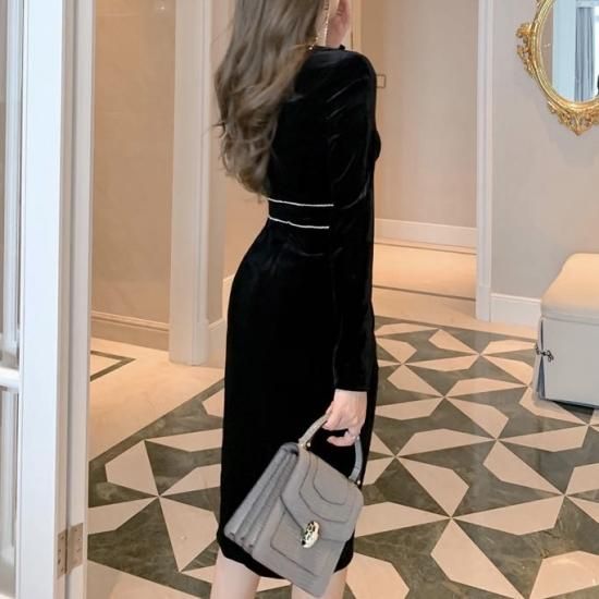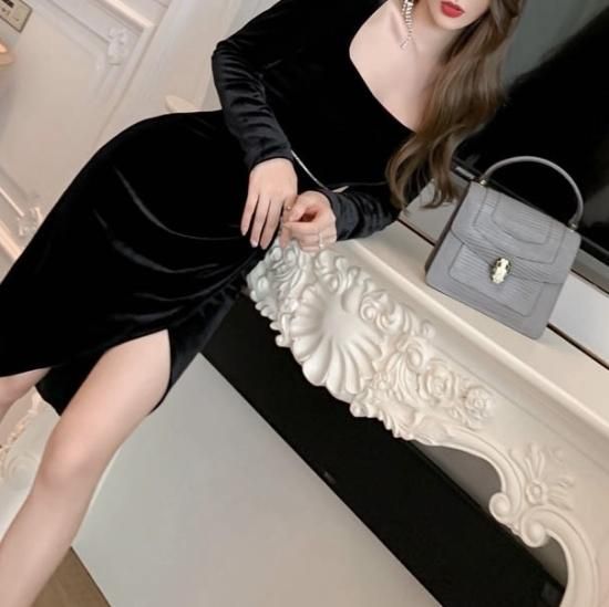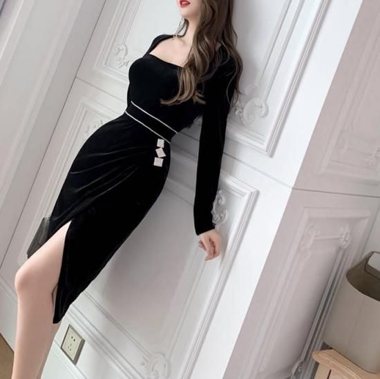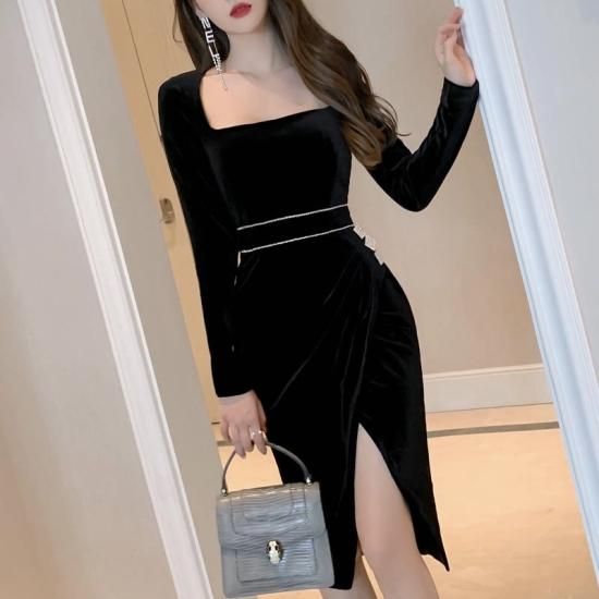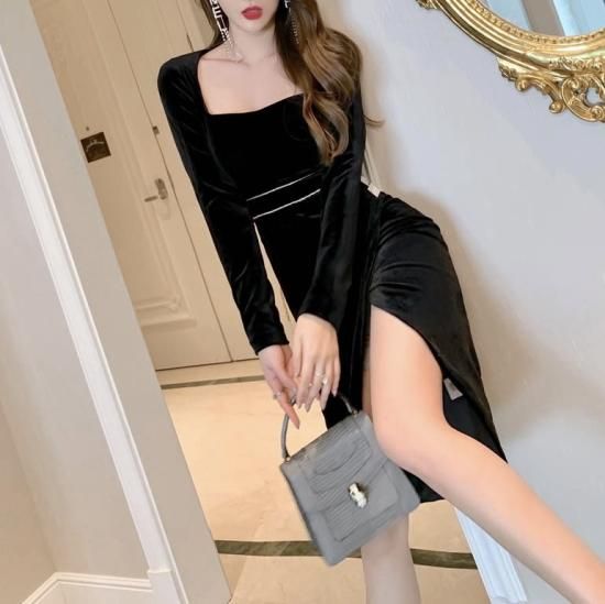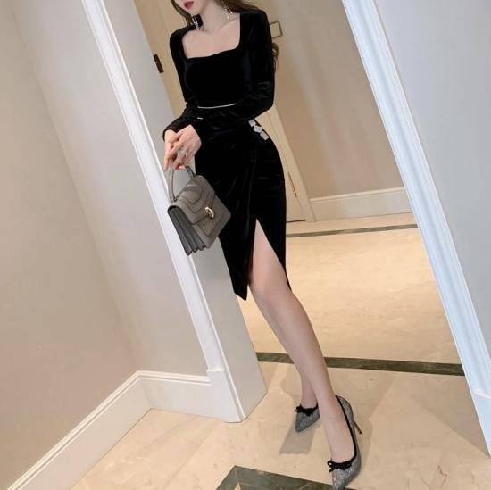 ドレス ベルベット スクエアネック 長袖 ハイウエスト 美脚効果 膝丈 大人 エレガント 秋冬 お呼ばれ 結婚式 二次会 ブラック系 S-L