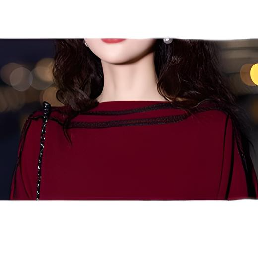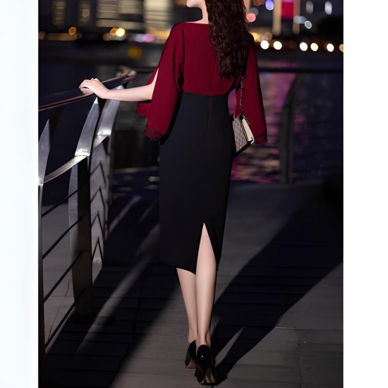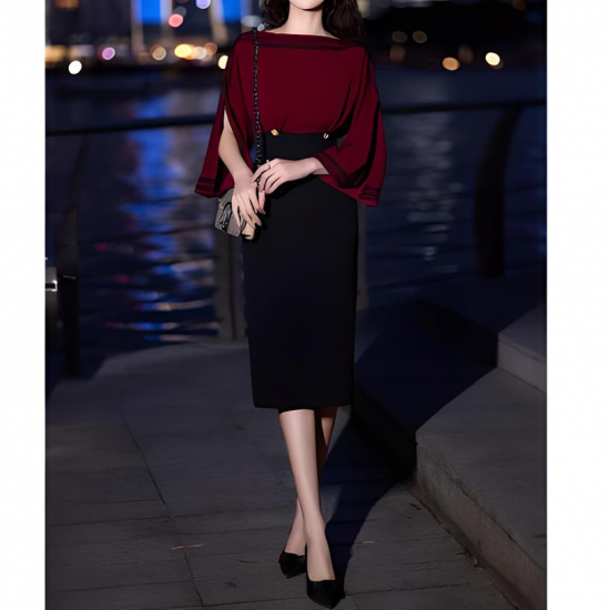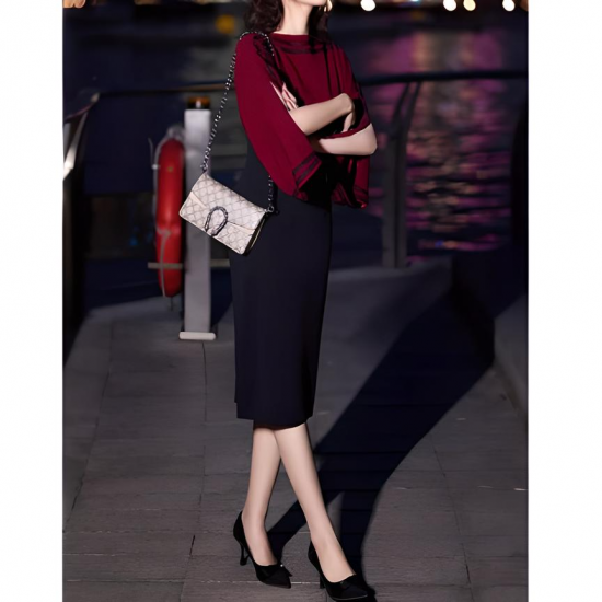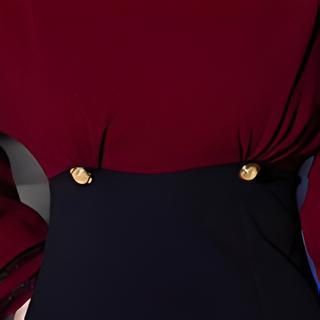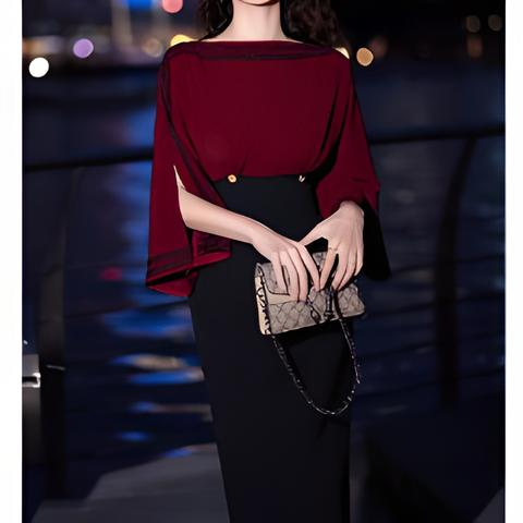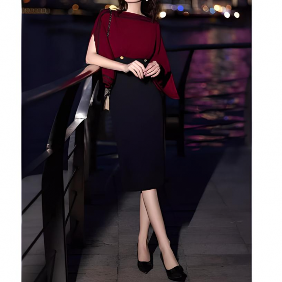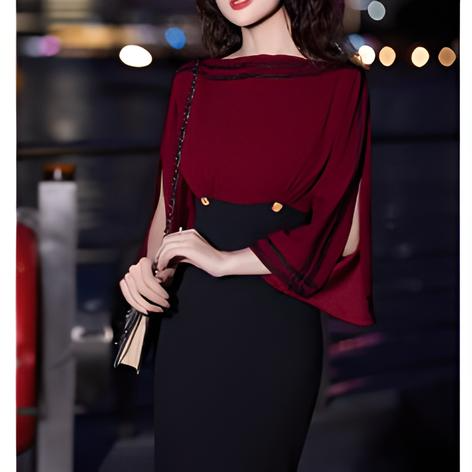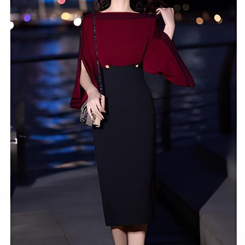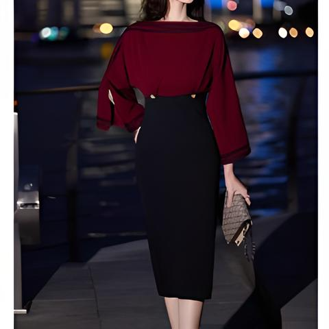 エレガントなバーガンディトップスとブラックタイトスカートの組み合わせが、大人の洗練されたスタイルを演出。トップスのケープ風デザインが動きと立体感を生み出し、ゴールドのボタンが上品なアクセントに。シンプルながらもクラシカルな印象の一着。足元はブラックヒールでまとめて、シックな雰囲気を際立たせて。